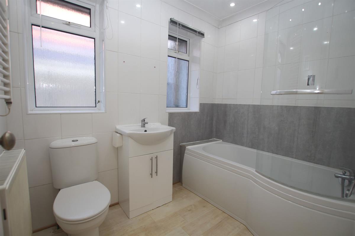 Three piece white bathroom suite comprising of panel enclosed bath with shower over and shower screen, vanity wash hand basin and low level W.C, laminate wood effect flooring, coved and textured ceiling with recessed spot lighting, fully tiled walls, double radiator, independent electric heated towel rail, two double glazed windows to side.