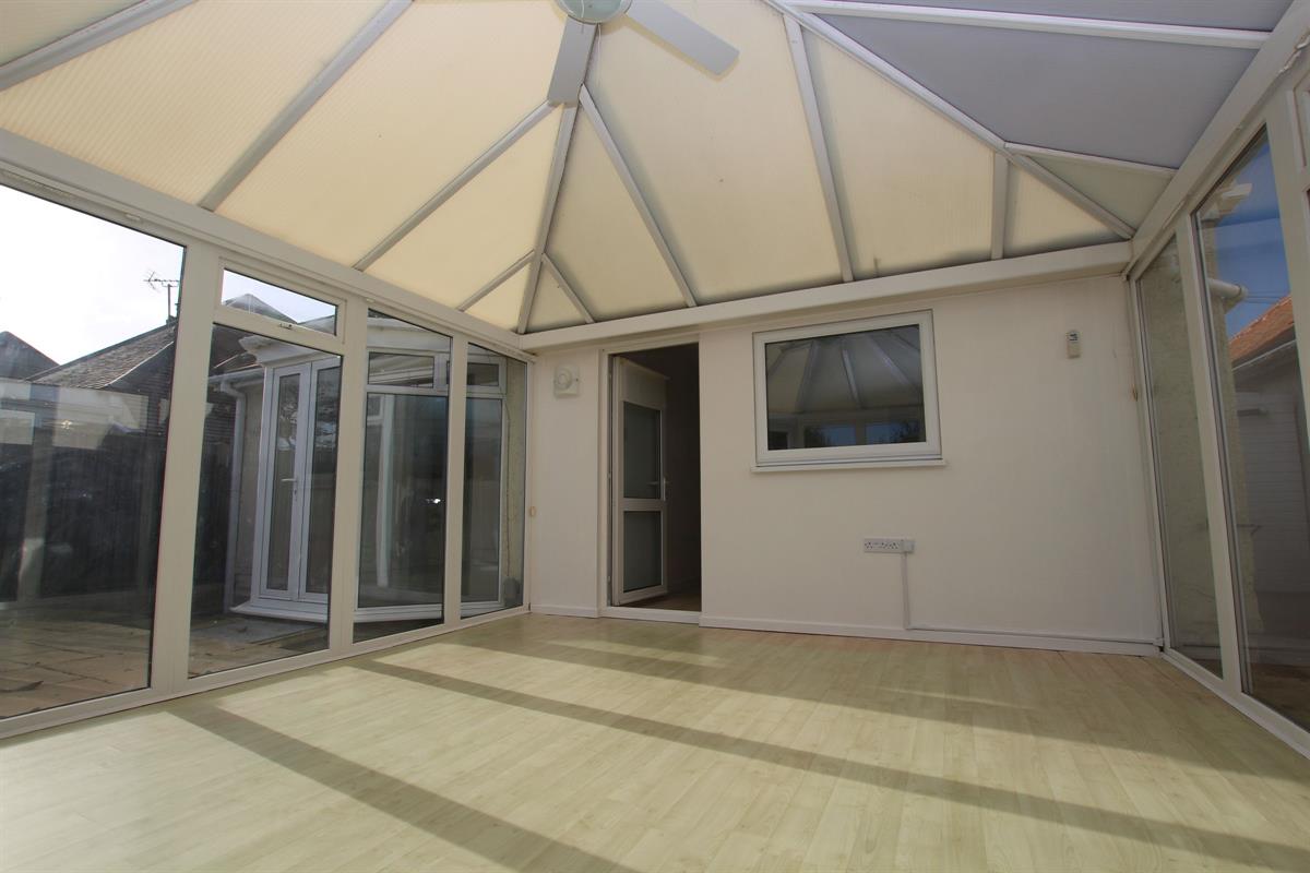 Laminate wood effect flooring, double glazed windows to side and rear, vaulted ceiling with fan light, double glazed French doors to rear garden.