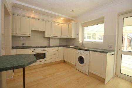 Double glazed window to rear, fitted kitchen comprising of single drainer sink unit with mixer taps set in roll edge work surfaces with cupboard under, further roll edge work surfaces with range of matching base and eye level units, space for washing machine, built in oven and hob with extractor hood over, wall mounted boiler (not tested) within matching cupboard, recess ideal for fridge freezer, coved and textured ceiling with recessed spot lighting, tiled splashback, double glazed door to