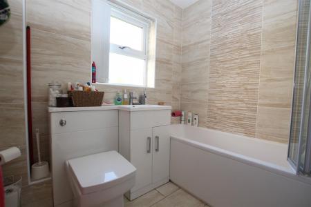 Modern three piece white bathroom suite comprising of panel enclosed bath with shower attachment and shower screen, low level w.c and wash hand basin, fully tiled walls and flooring, obscure double glazed window to rear