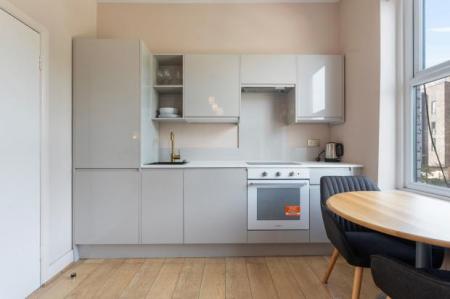 The apartment has been newly modernised to a high standard and features a bright, open-plan living space with a sleek fully integrated kitchen, wood flooring, and large sash windows that flood the room with natural light. The smart layout incorporates a cosy dining area and sleeping space, along with built-in storage, while the property also benefits from a fully tiled modern shower room and premium finishes throughout.