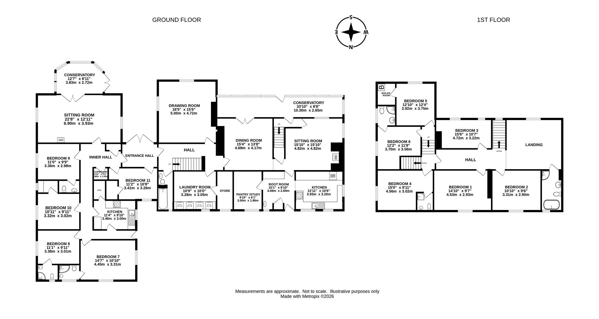 The main house comprises, the mainly, two storey original part, with a more recent single storey extension. The whole house benefits from 11 bedrooms, and 4 main reception rooms and has an appealing 34' conservatory.