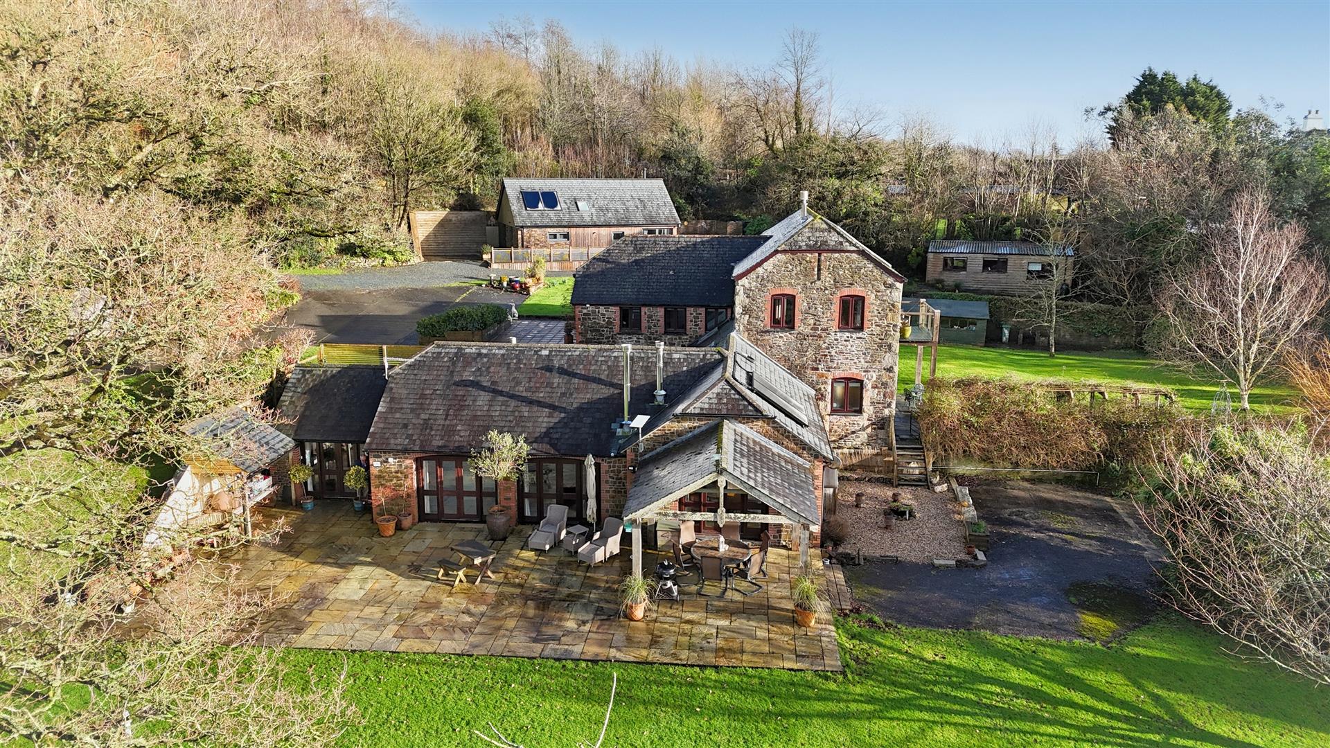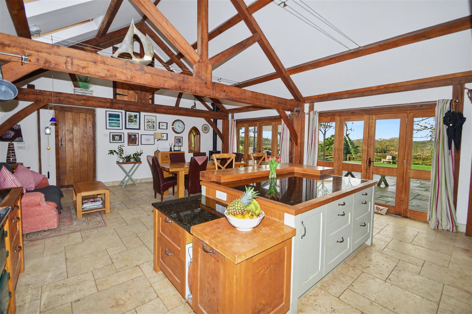 The accommodation briefly comprises; on the ground floor Sitting room; woodburner, French doors to the patio. Kitchen / dining room; vaulted ceiling with exposed oak 'A' framed beams, Velux windows and twin French doors to the rear opening onto the patio and lawned garden enjoying far reaching countryside views across the farm land and Tamar Valley. Solid oak fitted Kitchen, black granite worksurfaces inset Neff electric oven, dishwasher, full height pull out larder, large larder fridge with extensive drawers and cupboards with a large central island with breakfast bar, Travertine flooring, electric Aga with Aga intelligent management system (AIMS), four ovens and a dual ceramic hob to the side, woodburner. Utility, French doors to the front opening onto the patio fitted base units inset sink, space for washing machine, walk in larder cupboard, utility, cloakroom and 2 double ensuite bedrooms. On the first floor; master bedroom suite, balcony enjoying far reaching views, woodburner; dressing room, ensuite bathroom and 2 further ensuite double bedrooms.