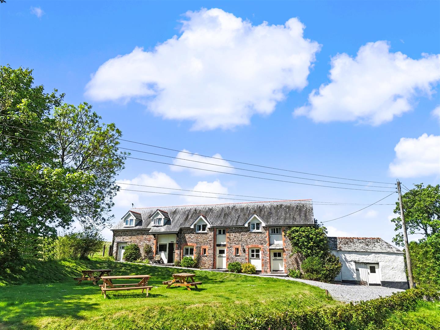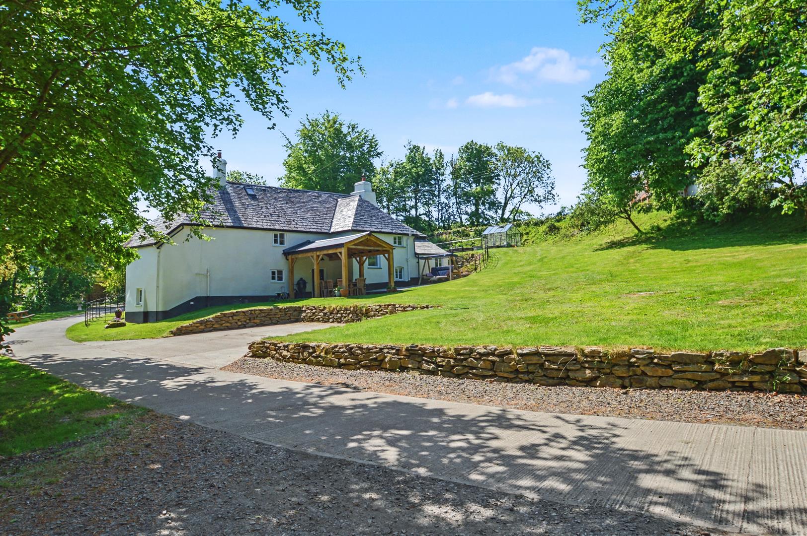 Outside - The property is accessed over a long shared concreted drive which divides providing access to the holiday cottages, then onto the house and parking area. At the front of the house is a large lawned garden, patio and pagoda covered patio which are ideal for alfresco dining and entertaining. At the rear of the house in an enclosed lawned garden with steps leading to a further lawned terrace.