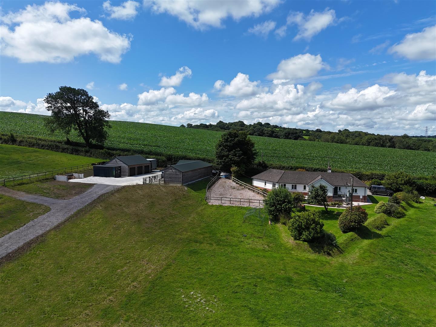 The accommodation briefly comprises; Front Entrance / Sun room; uPVC double glazed windows above dwarf walls. Entrance Hall; wood laminate flooring leading to carpeted corridor, airing cupboard and cloakroom cupboard. Sitting room; A light bright triple aspect room overlooking the garden and farmland, inset fireplace, woodburning stove and glazed French doors open to: Kitchen/ Dining Room; a triple aspect room with views over the valley, surrounding countryside, fitted wall and base units under granite effect worksurfaces, wood laminate flooring, fitted Bosch dishwasher and electric ovens, induction hob, extractor hood above. Utility Room; Fitted wall and base units, under slate effect worksurface, sink and draining board, space for washing machine and American style fridge / freezer, door to the rear, door to the integral garage. Cloakroom; window to the front, w/c and wash basin. Master bedroom, a double aspect room, window overlooking the front patio and French doors opening onto a further paved patio, fitted wardrobe and drawer units. Family Bathroom; tiled floor and walls, bath, w/c, wash basin and shower enclosure. Bedroom 2; a double aspect room, overlooking the garden valley and sand school. Bedroom 3; a further double room with window to the rear and fitted wardrobes. Planning consent has been granted to remodel and extend the bungalow to provide a further ensuite bedroom.