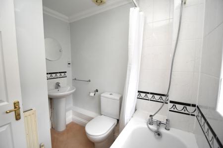 Bathroom White suite of panelled bath with mixer tap and shower, low level w.c., pedestal hand basin, part tiled walls, electric shave point, radiator.