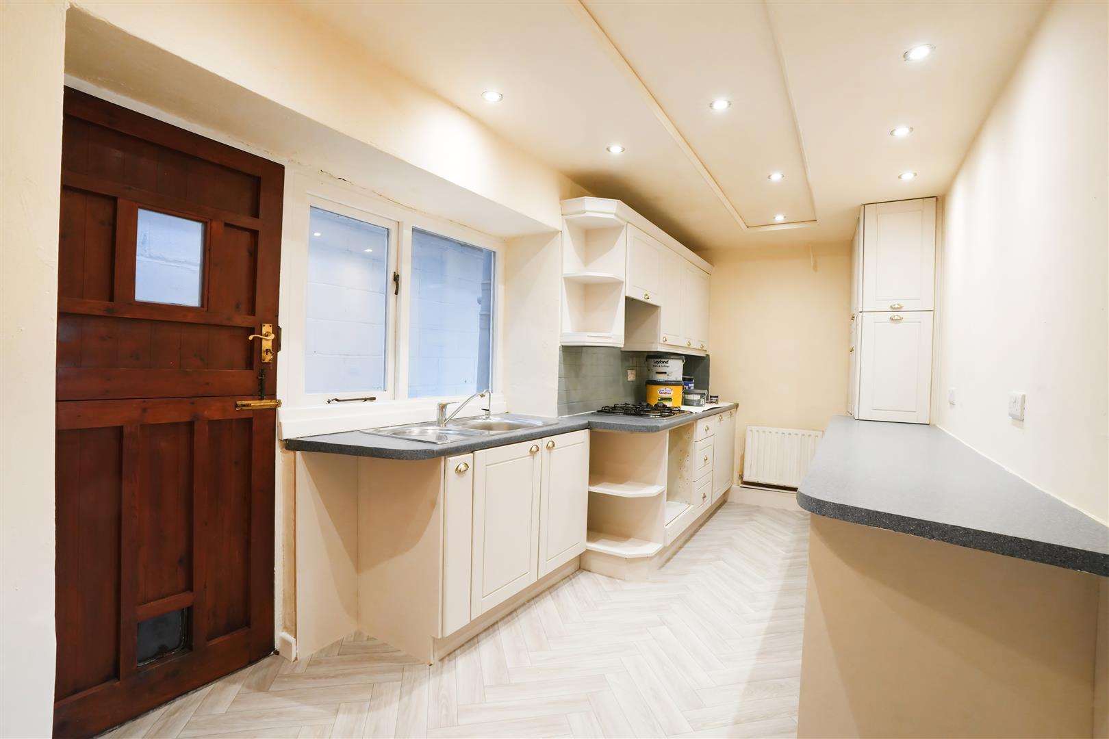 Dining Kitchen - 5.450 x 2.021 (17'10" x 6'7") - Fitted kitchen with a range of wall and base units. Stainless steel one bowl sink. Gas hob. Electric cooker point. Cooker hood. Plumbing for washing machine. Two radiators. Wooden stable door to rear elevation. Wooden double glazed window to rear elevation.