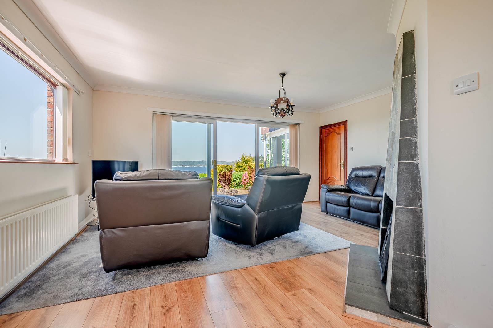 L-Shaped Living/Dining: - (8.86m x 5.31m) - With outlook to front and outlook to side and rear with panoramic views of Belfast Lough, the Antrim Hills and coastline, central open fire with Scrabo stone surround, laminate hardwood effect floors.