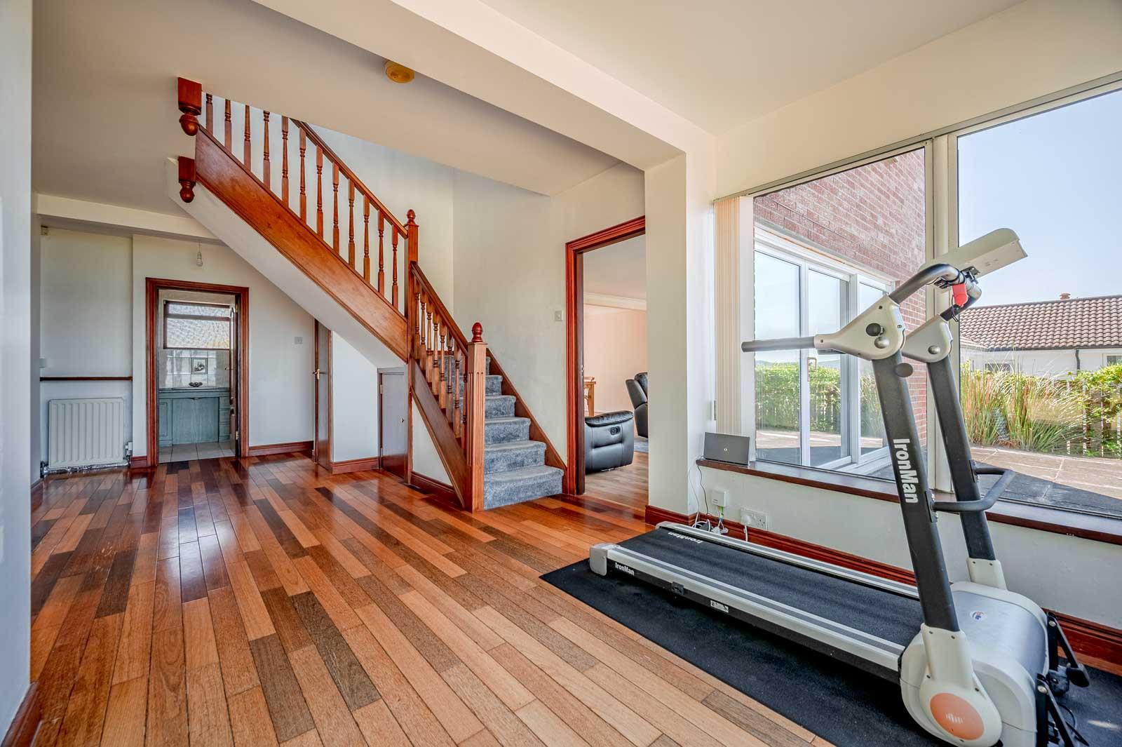 Dining Hall: - () - With hardwood floor, outlook to front with panoramic views from feature window across Belfast Lough to the Antrim Hills and coastline, access to rear garden, storage under stairs.