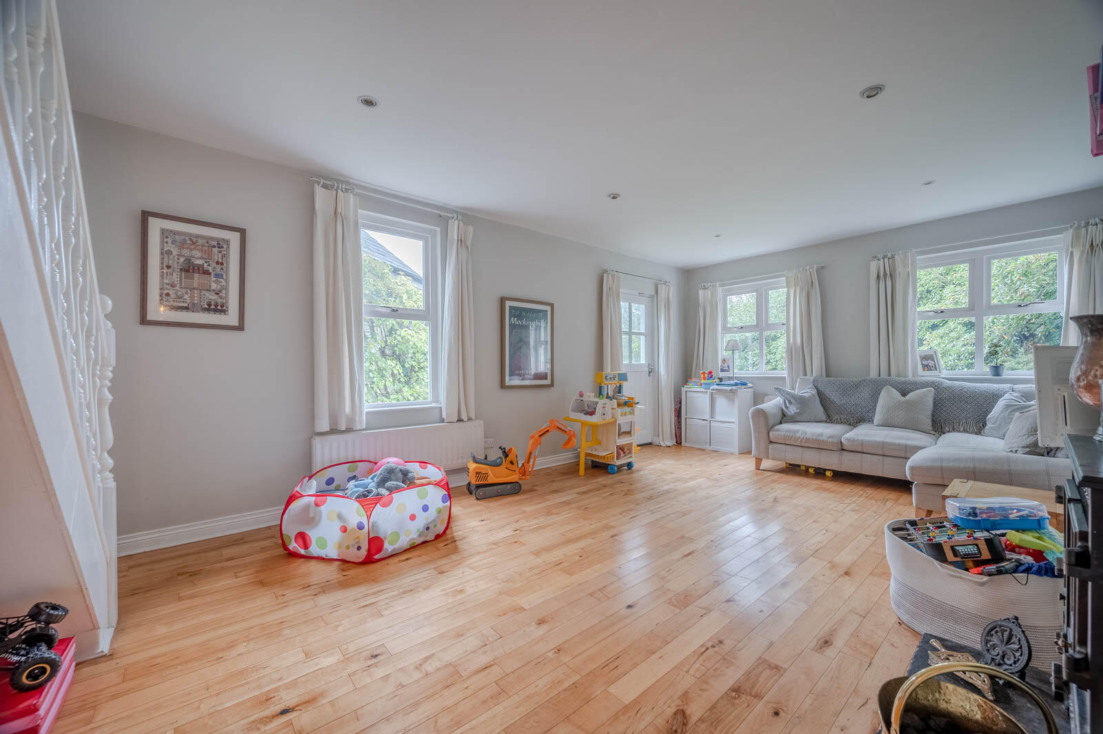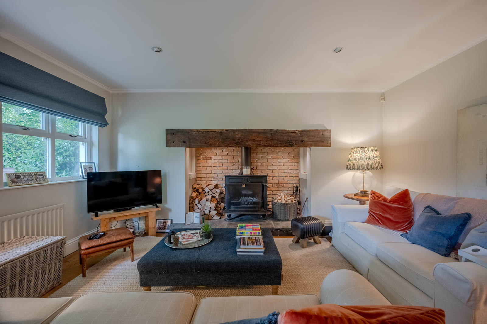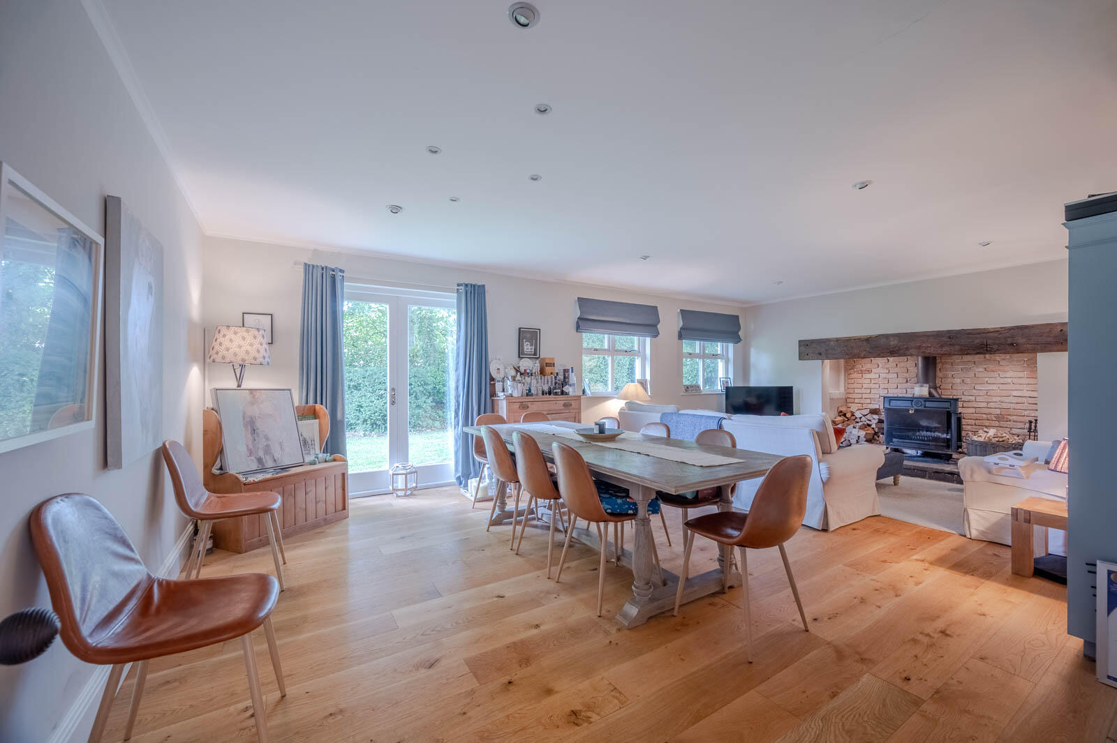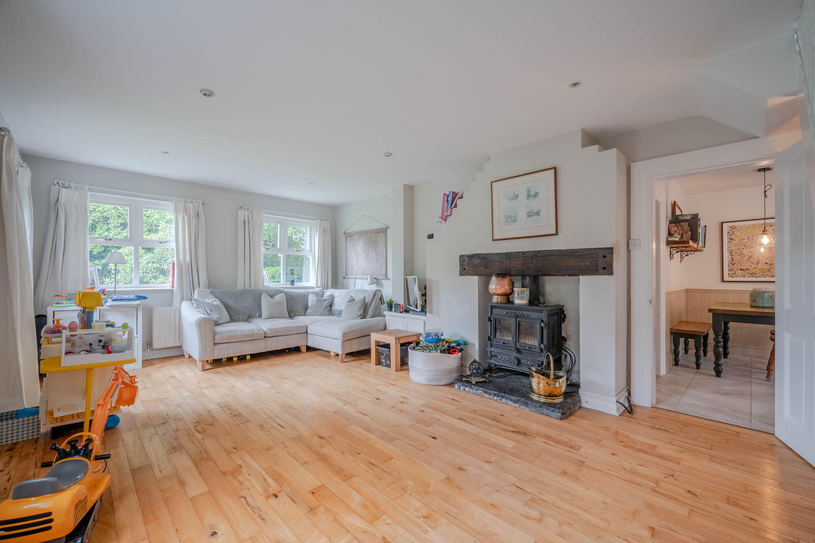 The principal reception rooms are ideal for both family living and entertaining. The drawing/dining room centres on an inglenook-style fireplace with a wood burning stove and French doors to the rear garden, while an additional reception room offers dual aspect outlooks, a second stove and access to the patio.