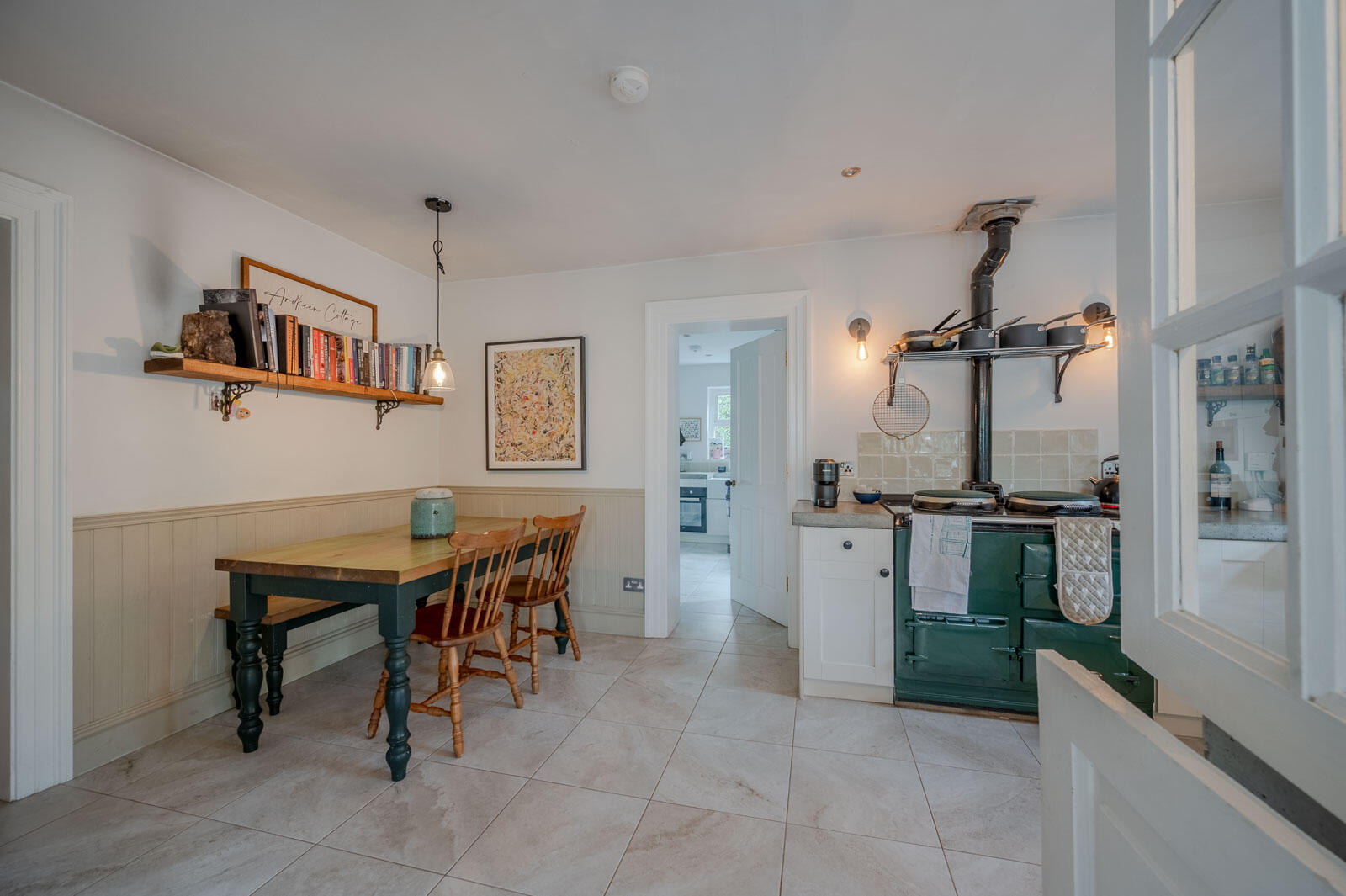 The interiors are full of charm and detail. A welcoming sun porch leads to the heart of the home, a generous kitchen with dining and living space. Featuring a polished concrete work surface, Shaker-style cabinetry, ceramic jawbox sink, and a traditional bottle-green Aga, the kitchen balances authenticity with function. A practical laundry/boot room adds excellent storage and utility.