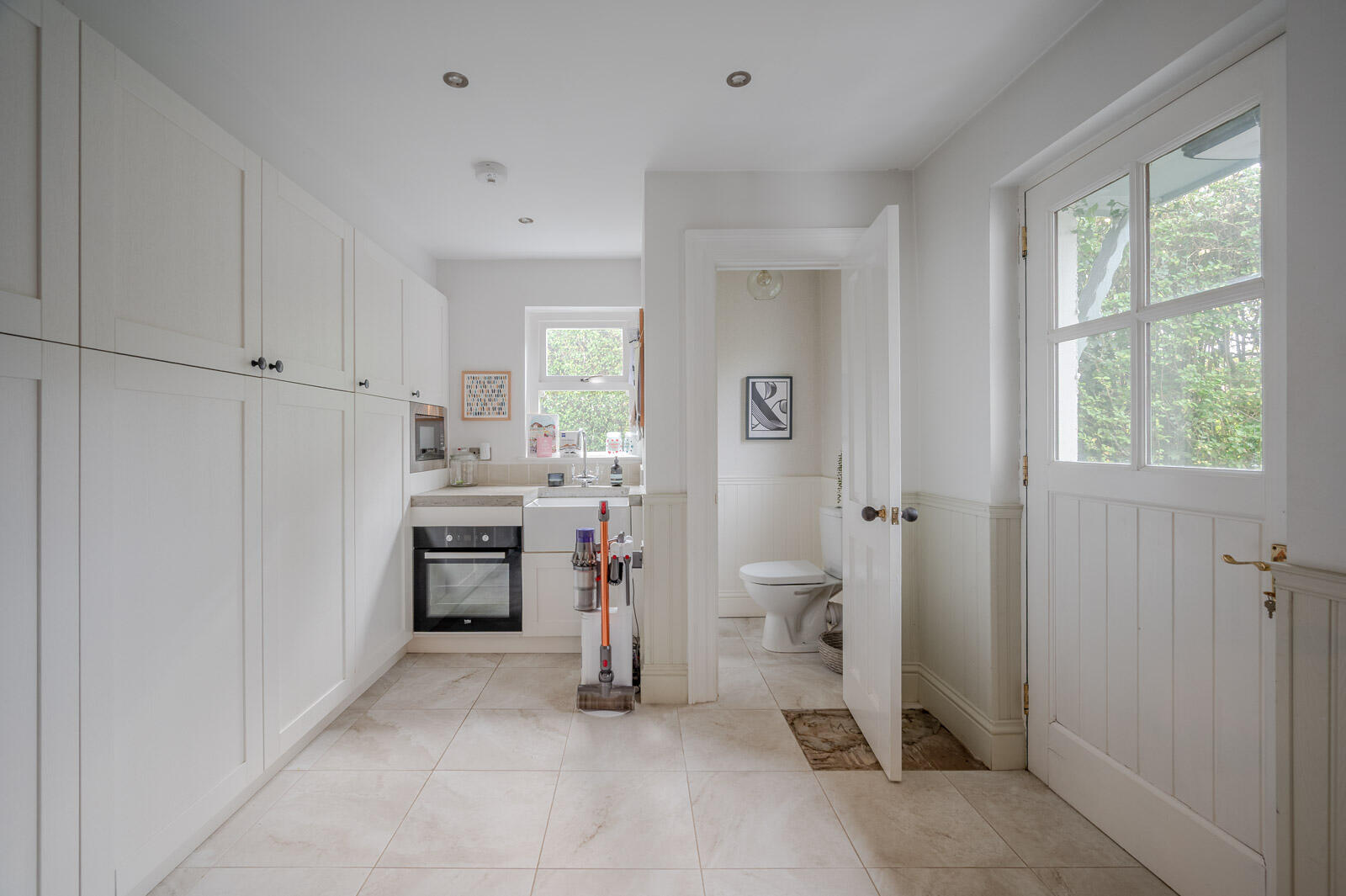 Laundry/Boot Room/Utility - 3.7 x 3.43 (12'1" x 11'3") - Matching range of built-in storage cabinets with pull-out larder, plumbed for washing machine, space for dryer above, integrated larder fridge, integrated stainless steel combination microwave and oven, ceramic jawbox inset sink unit, polished concrete work surfaces, chrome antique style mixer taps, part wood panelled walls, cloaks area, excellent storage, ceramic tiled floor and linen press with newly installed pressurised water cylinder, panelled bevelled access door to front driveway.