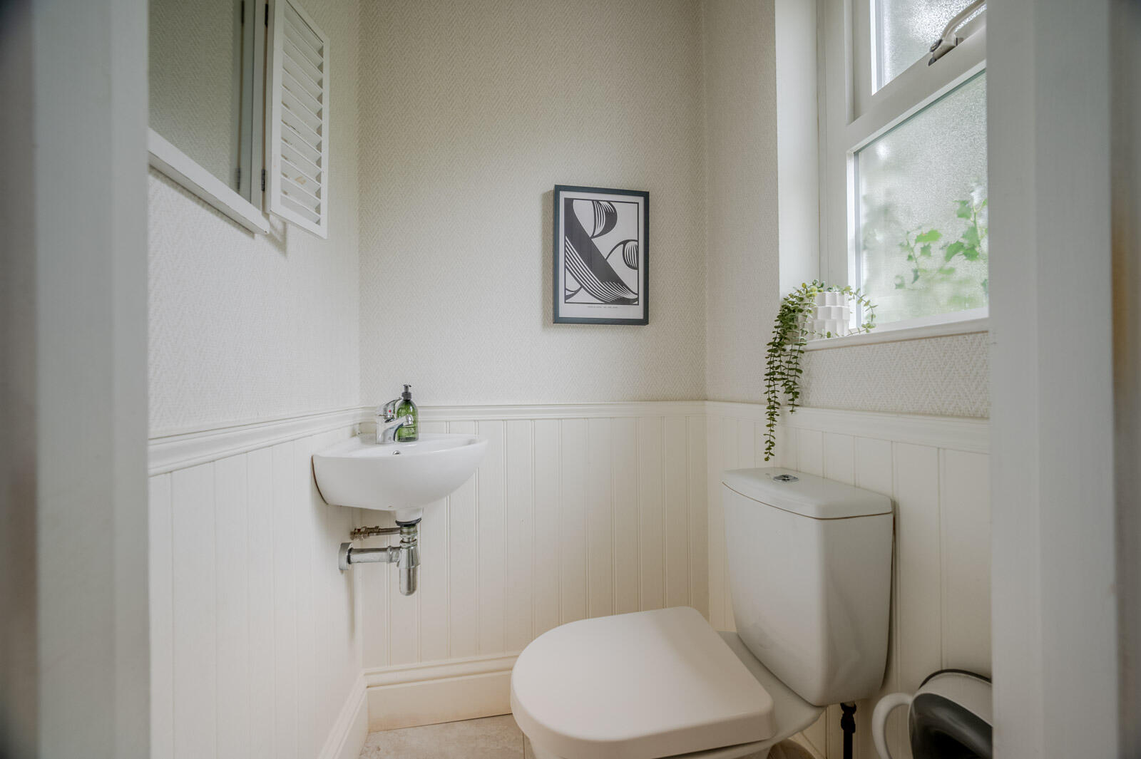Separate Ground Floor Wc - Ceramic tiled floor, part wood panelled walls, modern white suite comprising low flush WC, wash hand basin, recessed spotlighting.