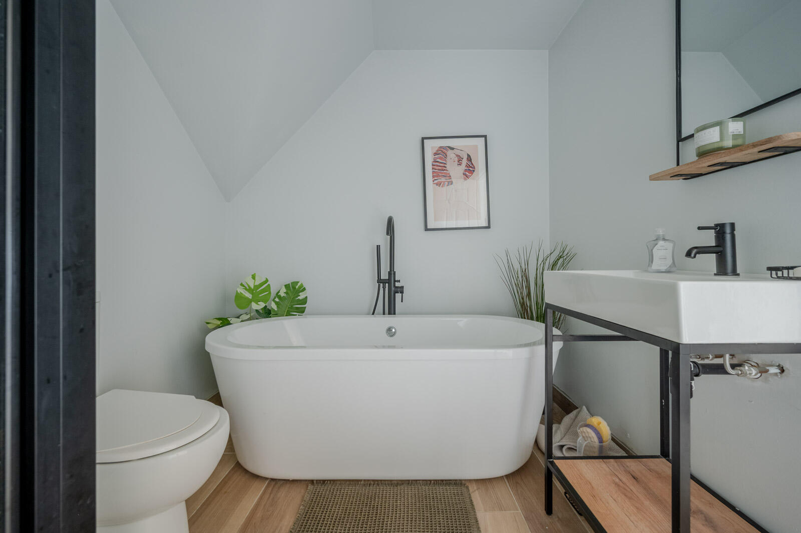 Bathroom - Modern white suite comprising low flush WC, wash hand basin on matt black stand and open shelf, matt black mixer tap, free standing modern panelled bath with floor mounted matt black mixer taps and telephone hand shower, built-in fully tiled shower cubicle with matt black thermostatically controlled shower unit, overhead drencher and shower attachment, heated towel rail, porcelain oak style ceramic tiled floor, recessed spotlighting.