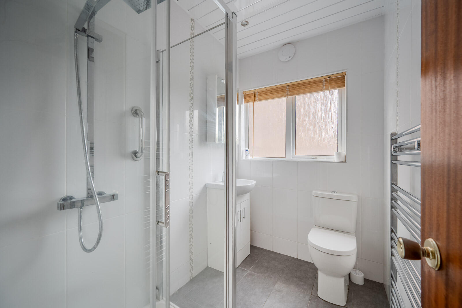 Shower Room - 2.46m x 1.75m (8'1 x 5'9) - White suite comprising of low flush WC, wall hung wash hand basin, chrome mixer tap, vanity storage below, walk-in thermostatically controlled shower, telephone handle attachment, drencher above, tiled walls, chrome heated towel rail, tiled floor, uPVC tongue and groove ceiling, inset spotlights.