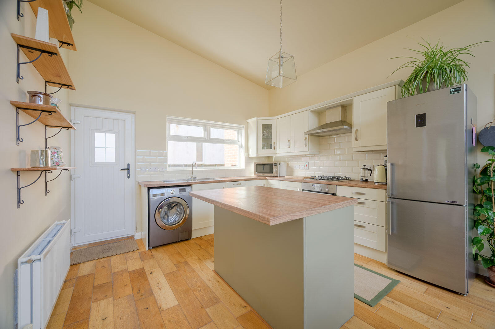 Kitchen/Dining Room - 5.44m x 3.76m (17'10 x 12'4) - Double height vaulted ceiling. Solid oak flooring. Fully fitted kitchen with range of high and low level units, Neff fan assisted electric oven, integrated Bosch dishwasher, space for washing machine, stainless steel Franke sink and a half with drainer, mixer taps, subway style tiling, four ring Neff gas hob, extractor hood above, space for fridge freezer, island unit with casual breakfast bar dining area and additional storage below, double glazed access door to side patio and uPVC door with access to side with attached garage.