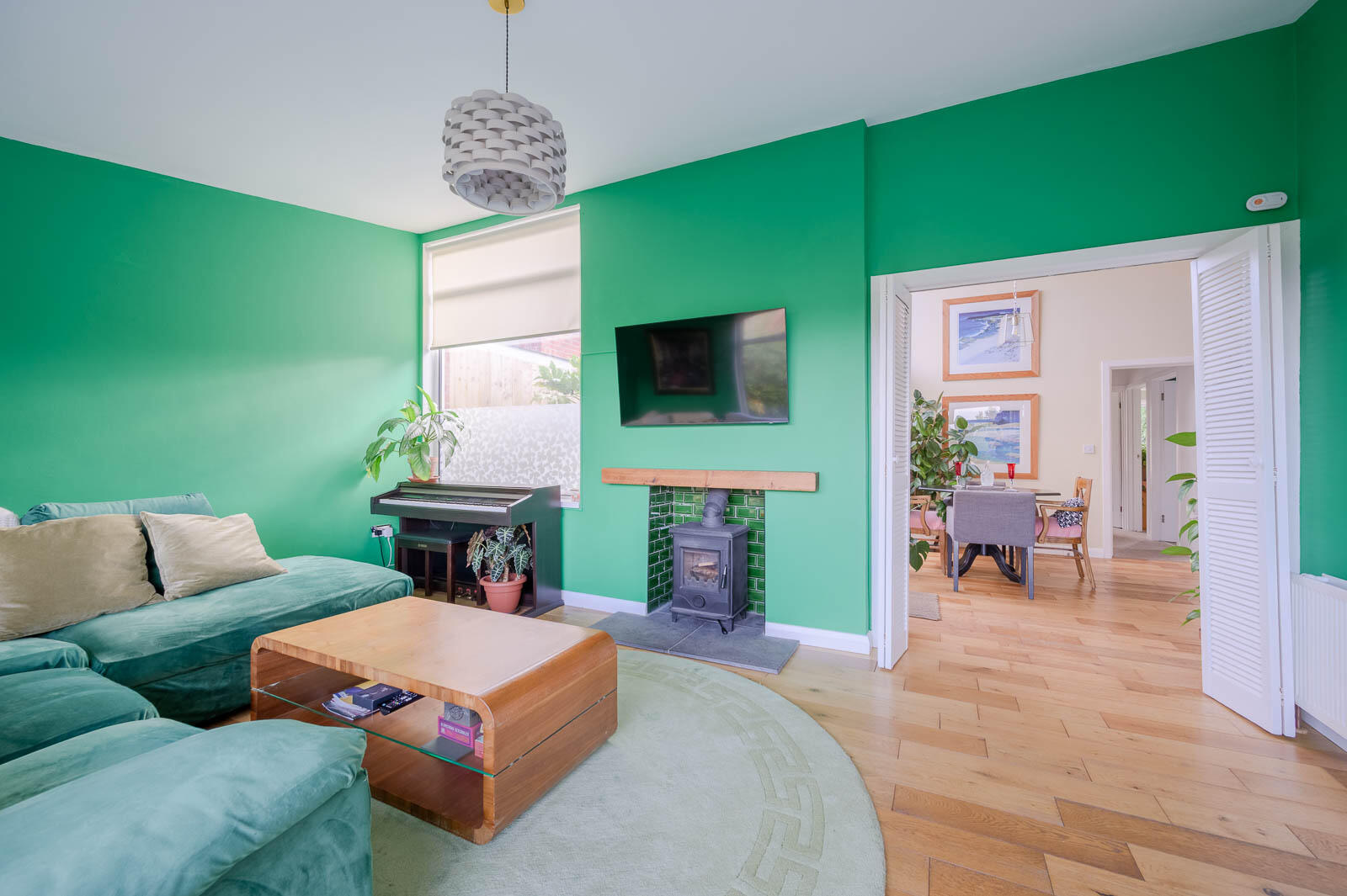 Lounge - 5.33m x 4.06m (17'6 x 13'4) - Vaulted ceiling. Solid oak flooring. Large spacious room with picture window with outlook to mature front garden, and leafy aspect to Ballymenoch Park, providing privacy and seamless blending of outdoors and in. Wood burning stove with slate hearth, tiled inset and floating timber mantel, sliding louvre doors leading through to kitchen/diner.