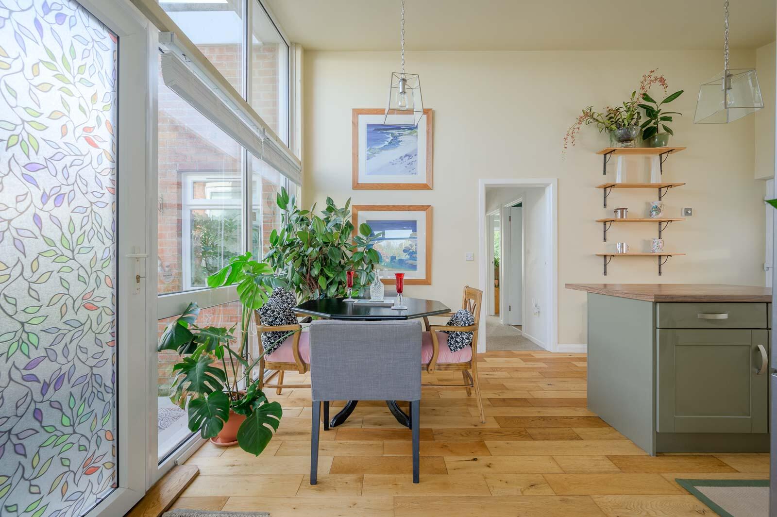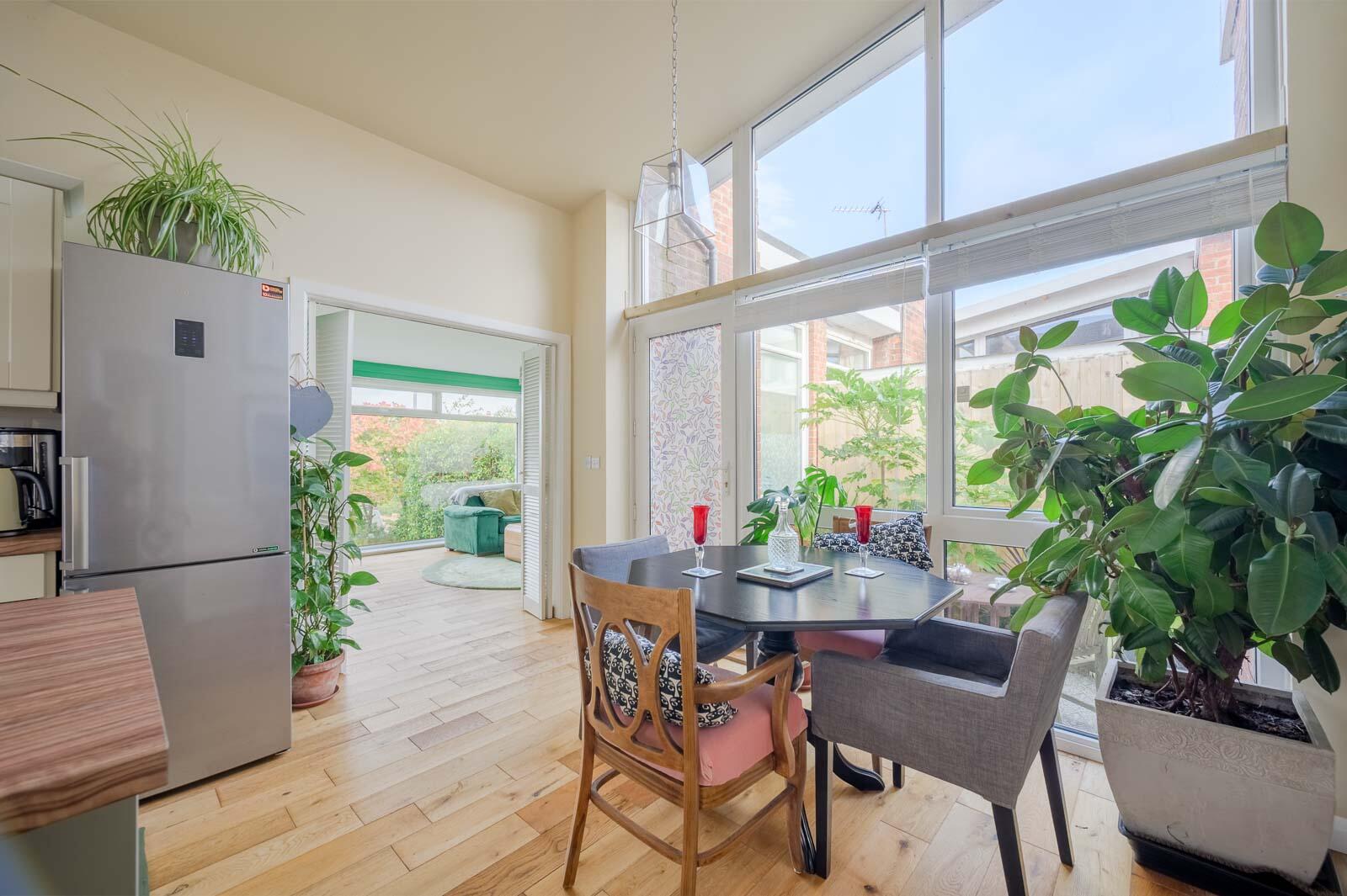 .Bright and spacious open plan living and dining layout with high vaulted ceilings and solid oak flooring.