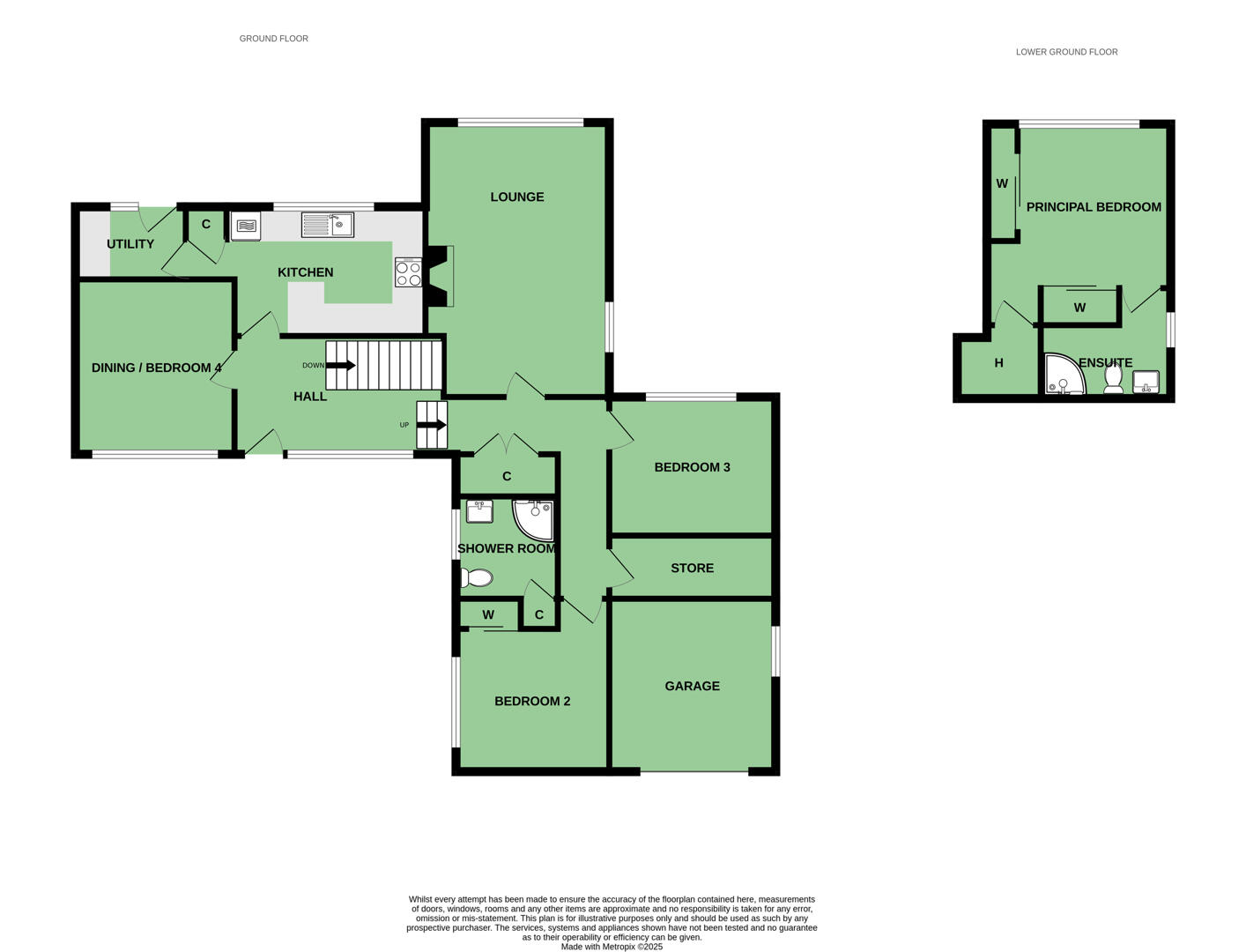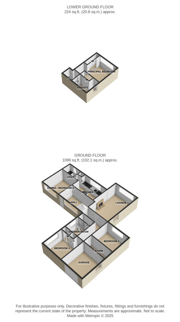 On the lower ground floor, the principal bedroom benefits from garden views, built-in storage, and a modern en suite shower room. The arrangement of accommodation across different levels allows for flexibility and privacy, suiting a variety of buyers and family requirements.