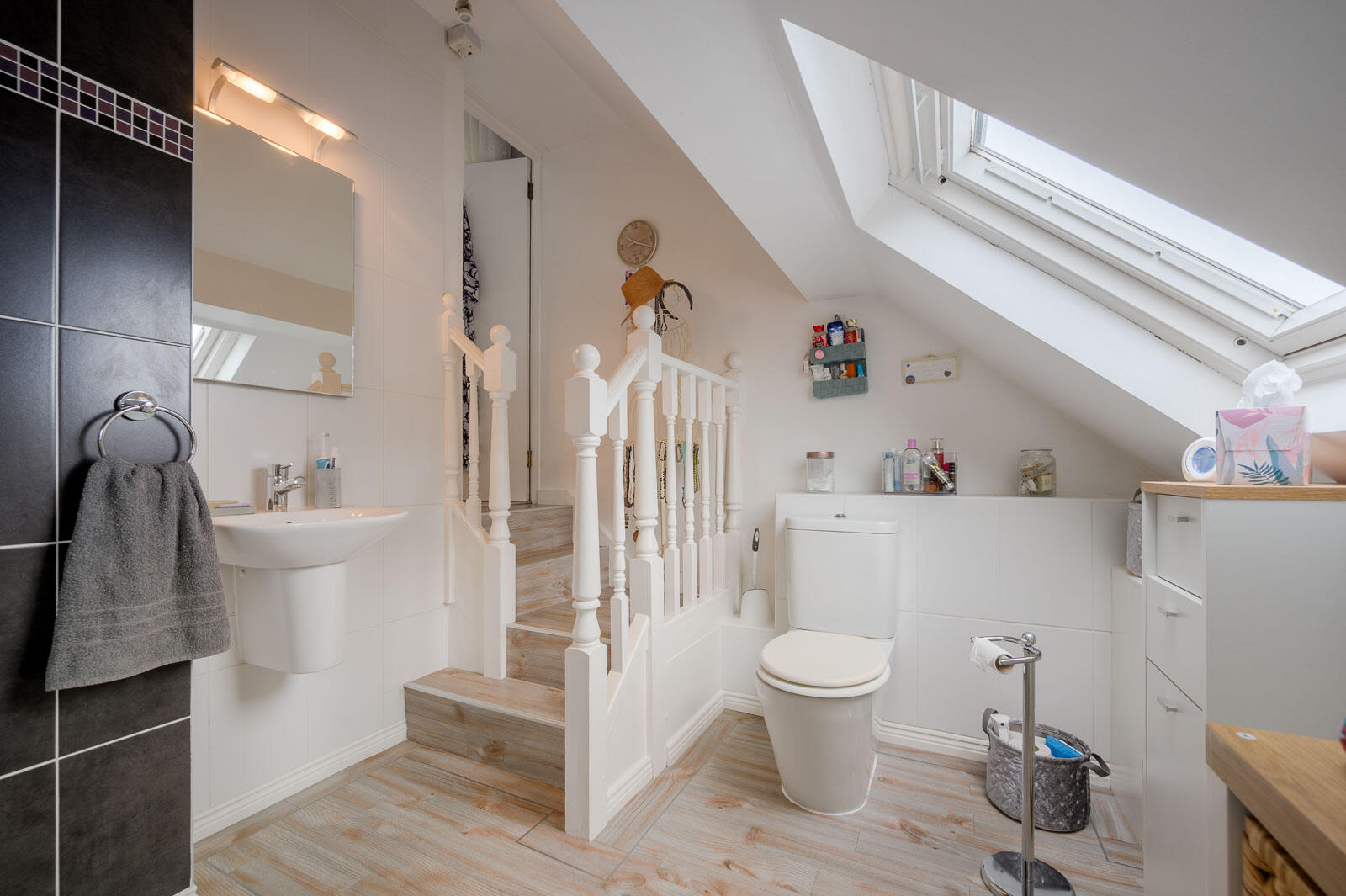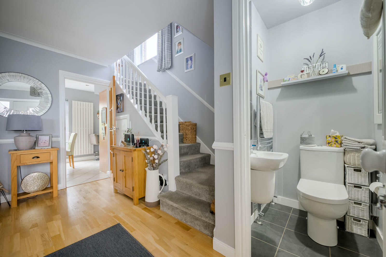 Downstairs Wc - With low flush WC, wall hung wash hand basin, tiled splashback, chrome heated towel rail, tiled floor, storage under stairs with light.