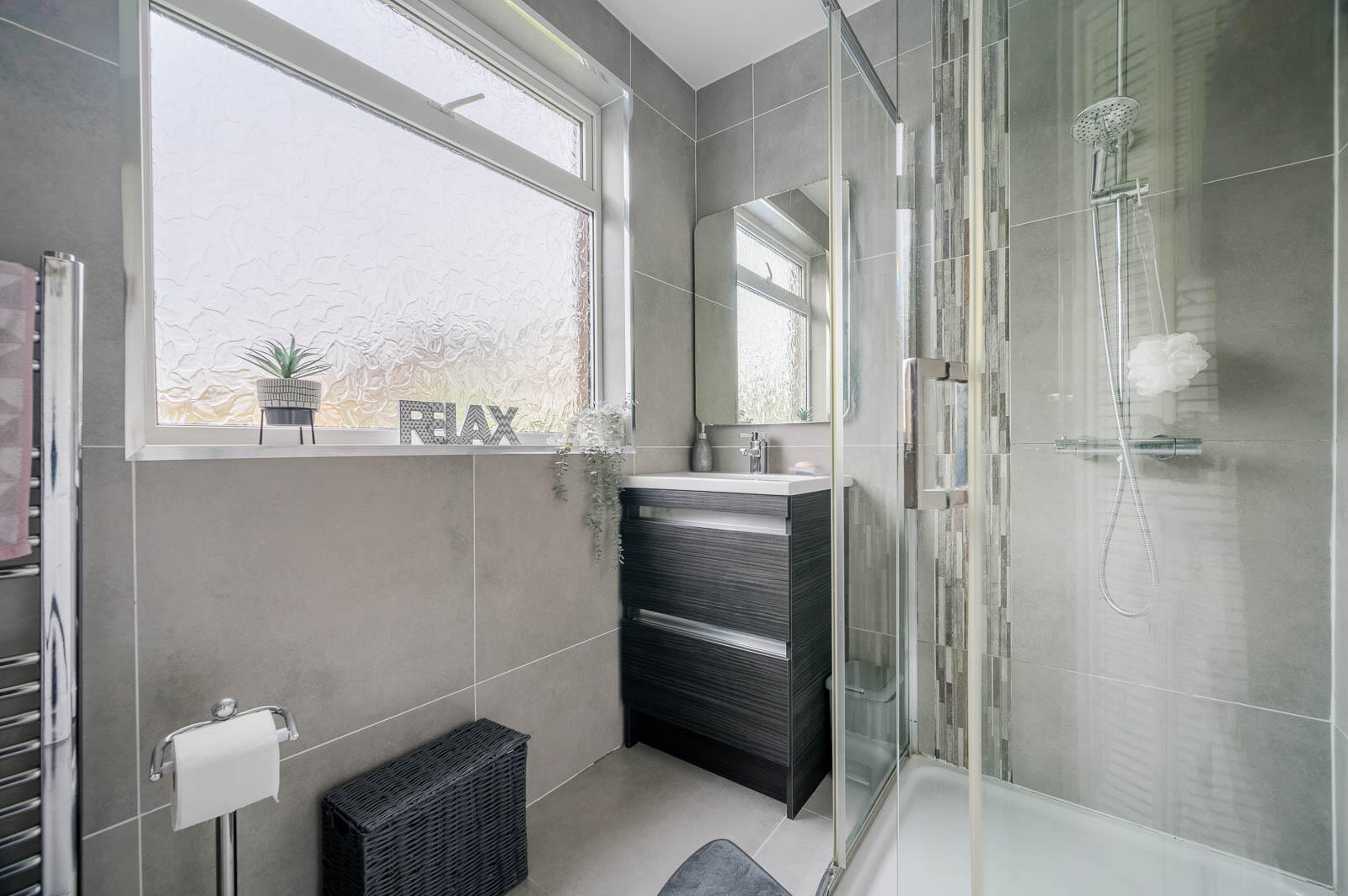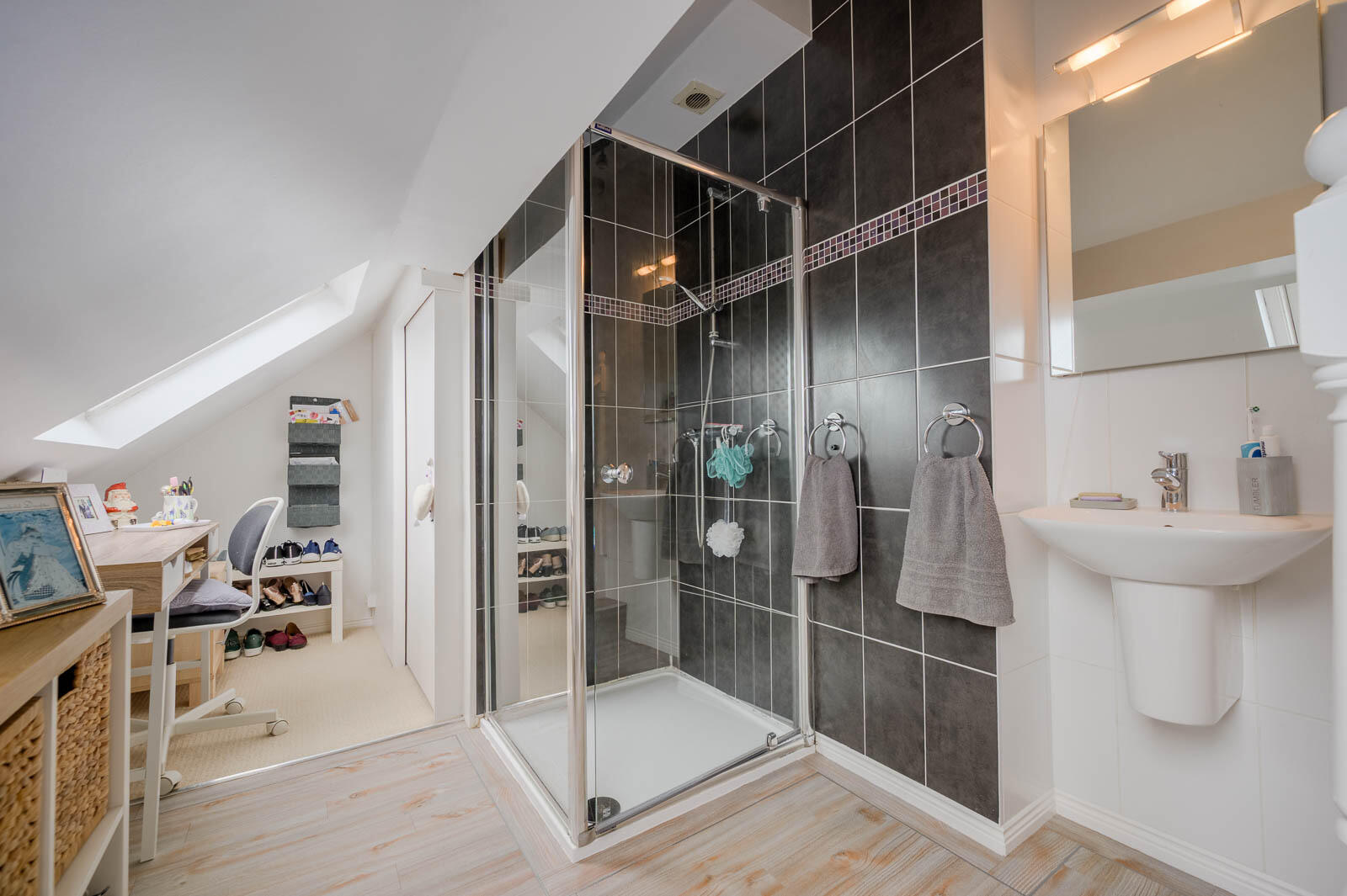 Shower Room - 2.87m x 2.03m (9'5 x 6'8) - White suite comprising of close coupled WC, wall hung wash hand basin, chrome mixer tap, vanity storage below, walk-in thermostatically controlled shower, telephone handle attachment, drencher above, tiled walls, inset spotlights, hotpress cupboard with shelving, chrome heated towel rail, tiled floor, access to roofspace via Slingsby ladder.