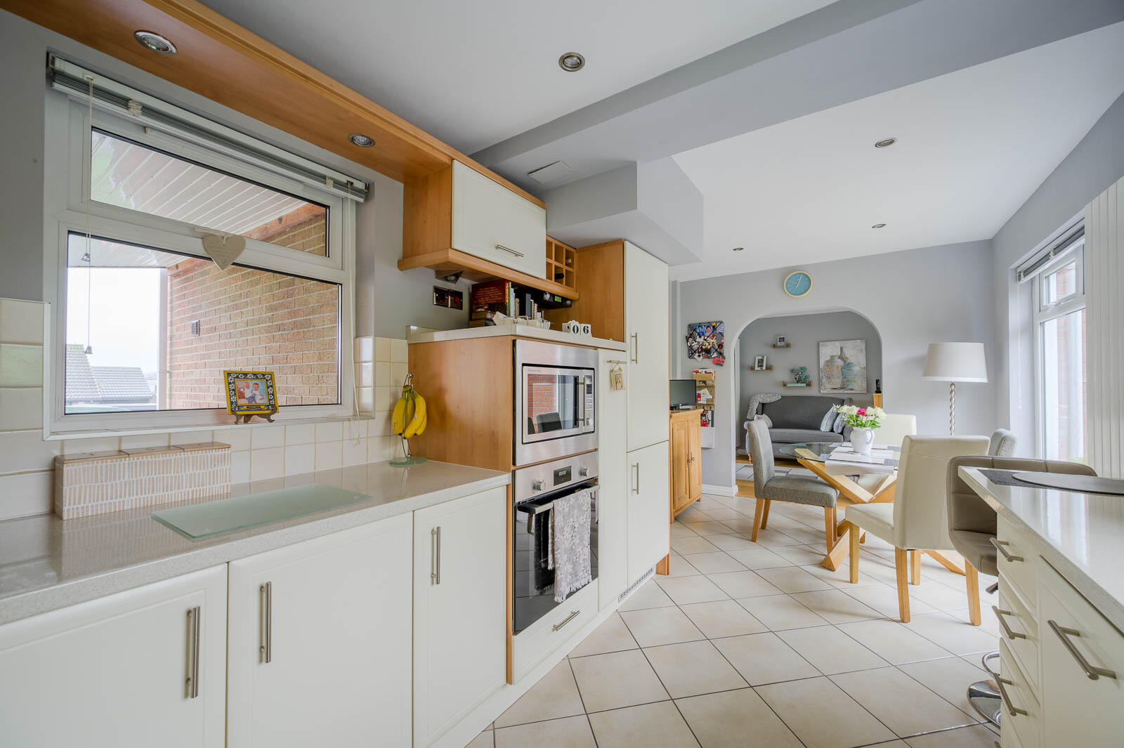 Kitchen - 6.02m x 3.10m (19'9 x 10'2) - Range of high and low level units, integrated dishwasher, stainless steel sink and a half with drainer, chrome mixer taps, outlook to rear, five ring gas hob, stainless steel splashback, stainless steel extractor fan, integrated microwave, integrated oven, integrated fridge, integrated freezer, laminate granite effect work surface and casual single breakfast bar dining space, outlook to rear garden, ceramic tiled floor, ample space for dining, archway leading through to family room