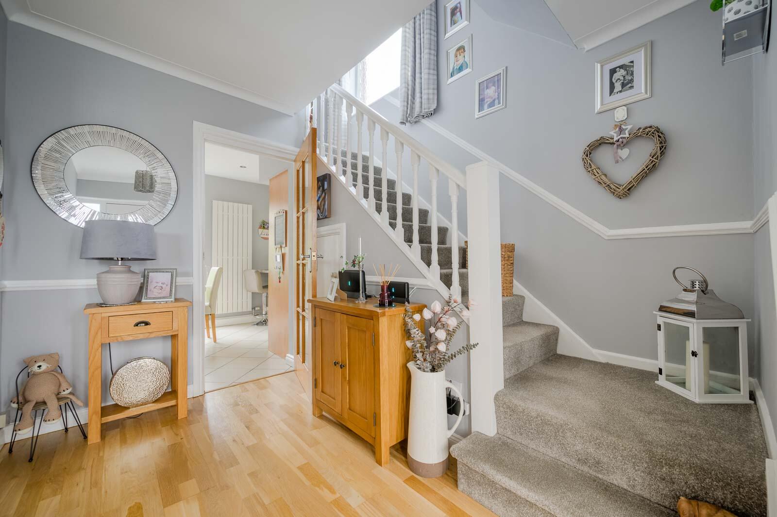The home offers bright and well-balanced accommodation arranged over two floors, with generous reception space and a practical layout suited to modern living, of particular note is the cosy garden room with wood burning stove. The interiors benefit from an abundance of natural light, creating a warm and welcoming atmosphere throughout. To the first floor there are three well-proportioned bedrooms, primary with en-suite shower room and an additional family bathroom. Outside, the property sits on an attractive site with mature gardens that offer privacy. Driveway parking, a car port and a garage add to the overall convenience.