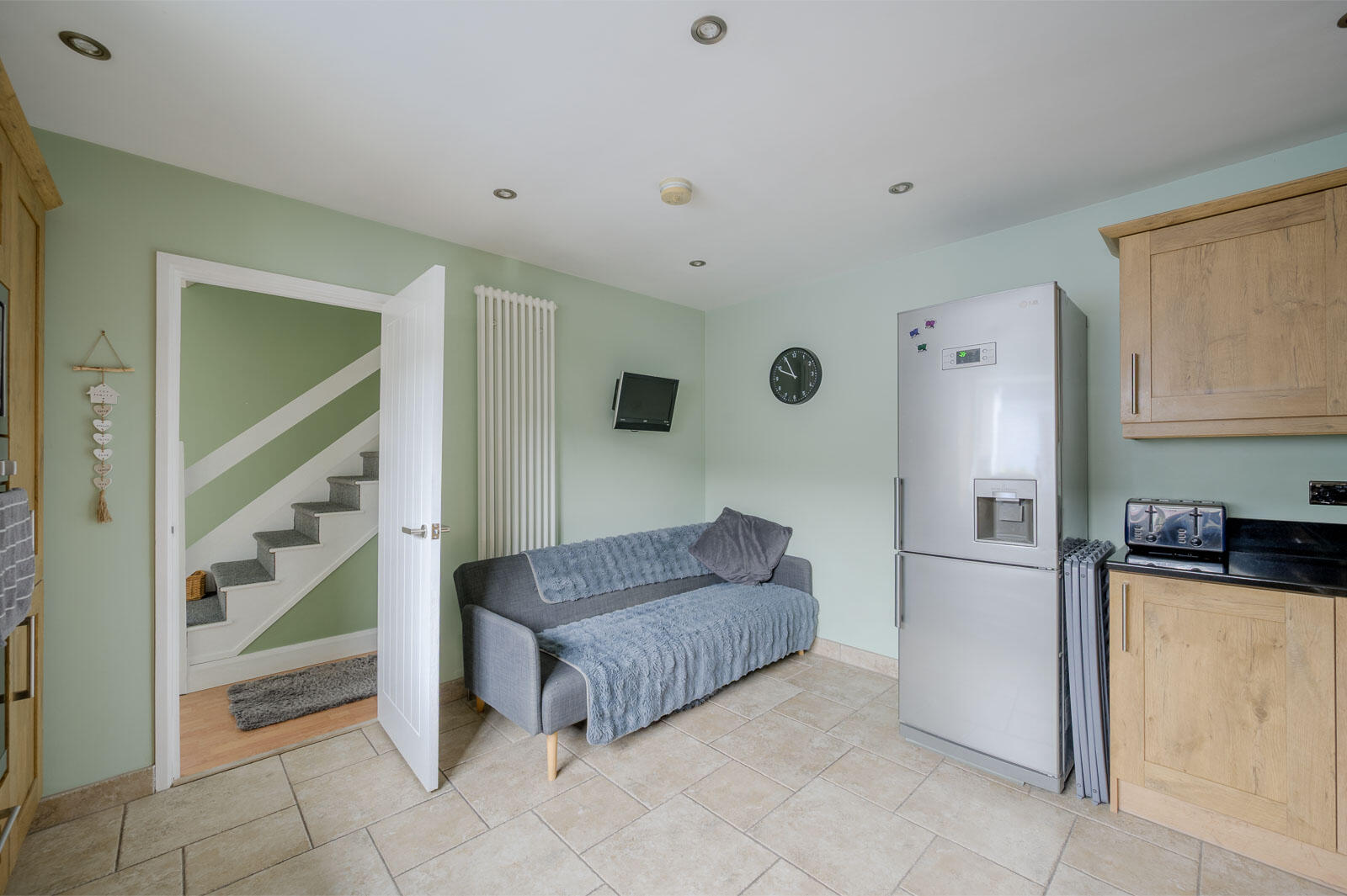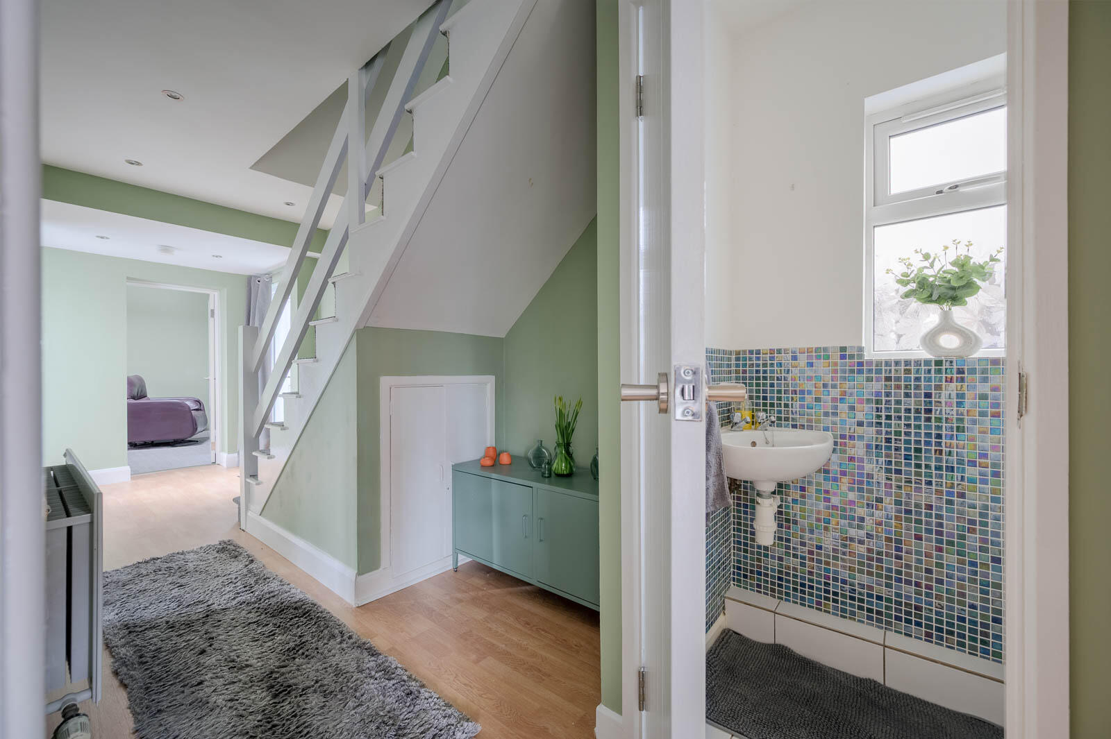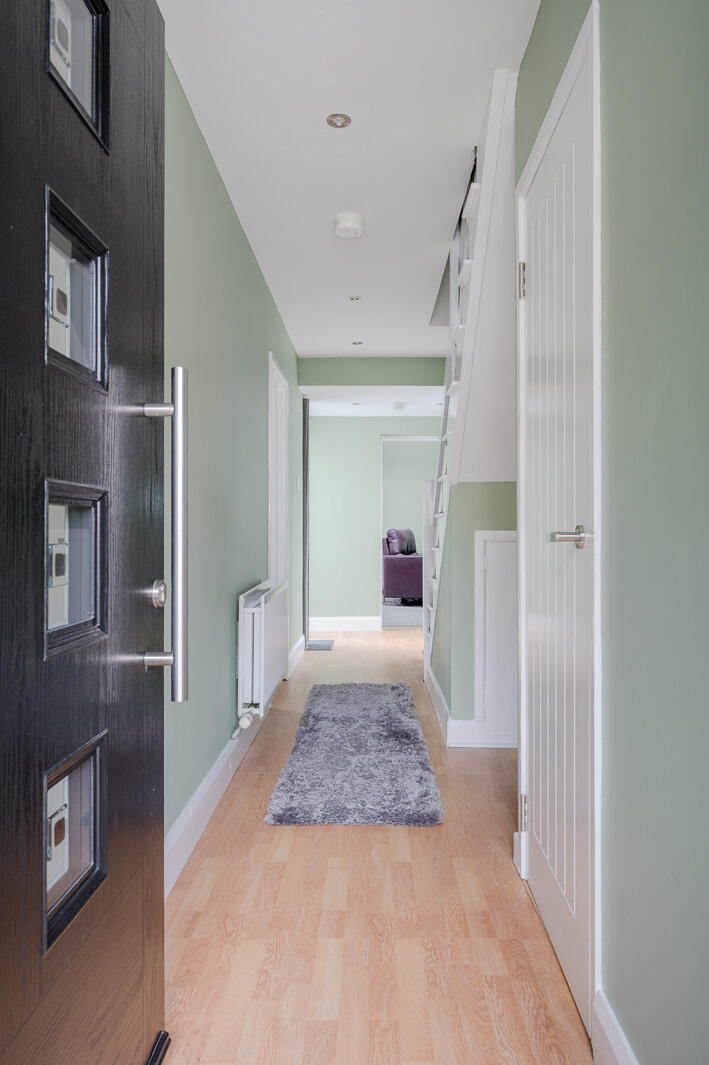 Rear Hallway - Laminate wood effect floor to rear hallway with access door to rear patio, outside tap, fully enclosed with new fence and additional access door to side entry. Both doors have frosted glass.