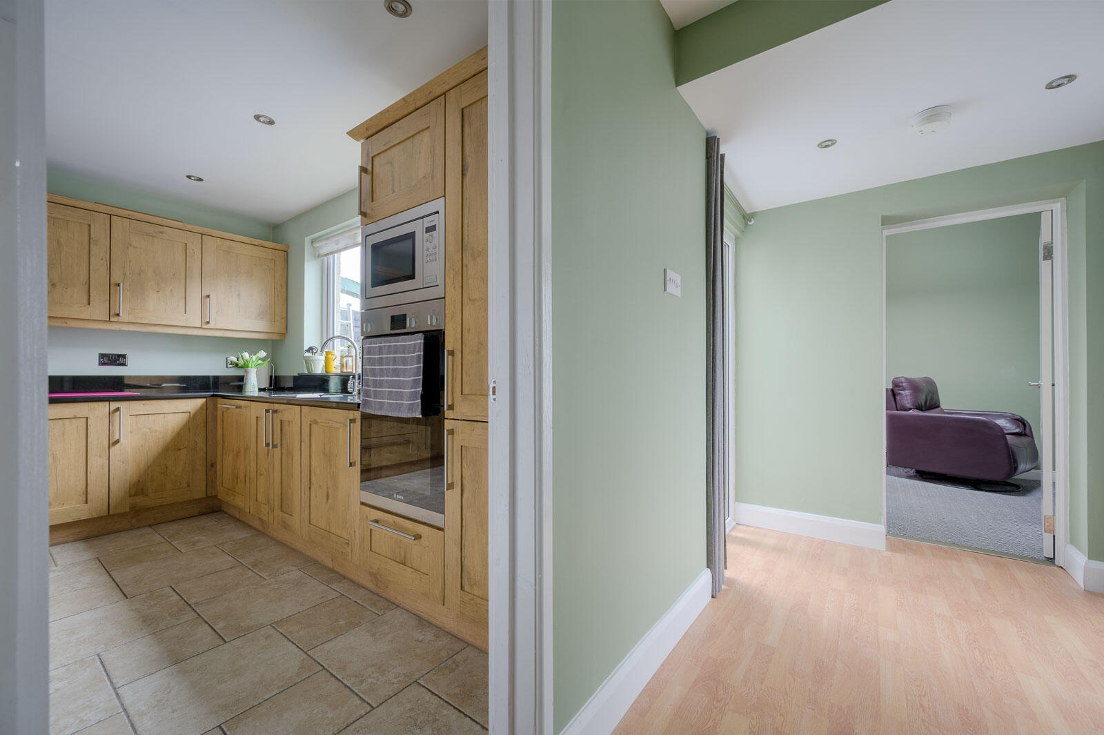 Kitchen/Dining - 3.91m x 3.35m (12'10 x 11'0) - Kitchen with range of high and low level units, integrated dual oven, integrated microwave, granite work surface, splashback and windowsill, stainless steel sink with chrome mixer taps, outlook to rear courtyard, integrated dishwasher, four ring hob, stainless steel extractor, space for fridge freezer, tiled floor. Dedicated cupboard housing the cooker, hob and dishwasher sockets, keeping all electrical connections neatly concealed for a clean and uncluttered finish.
