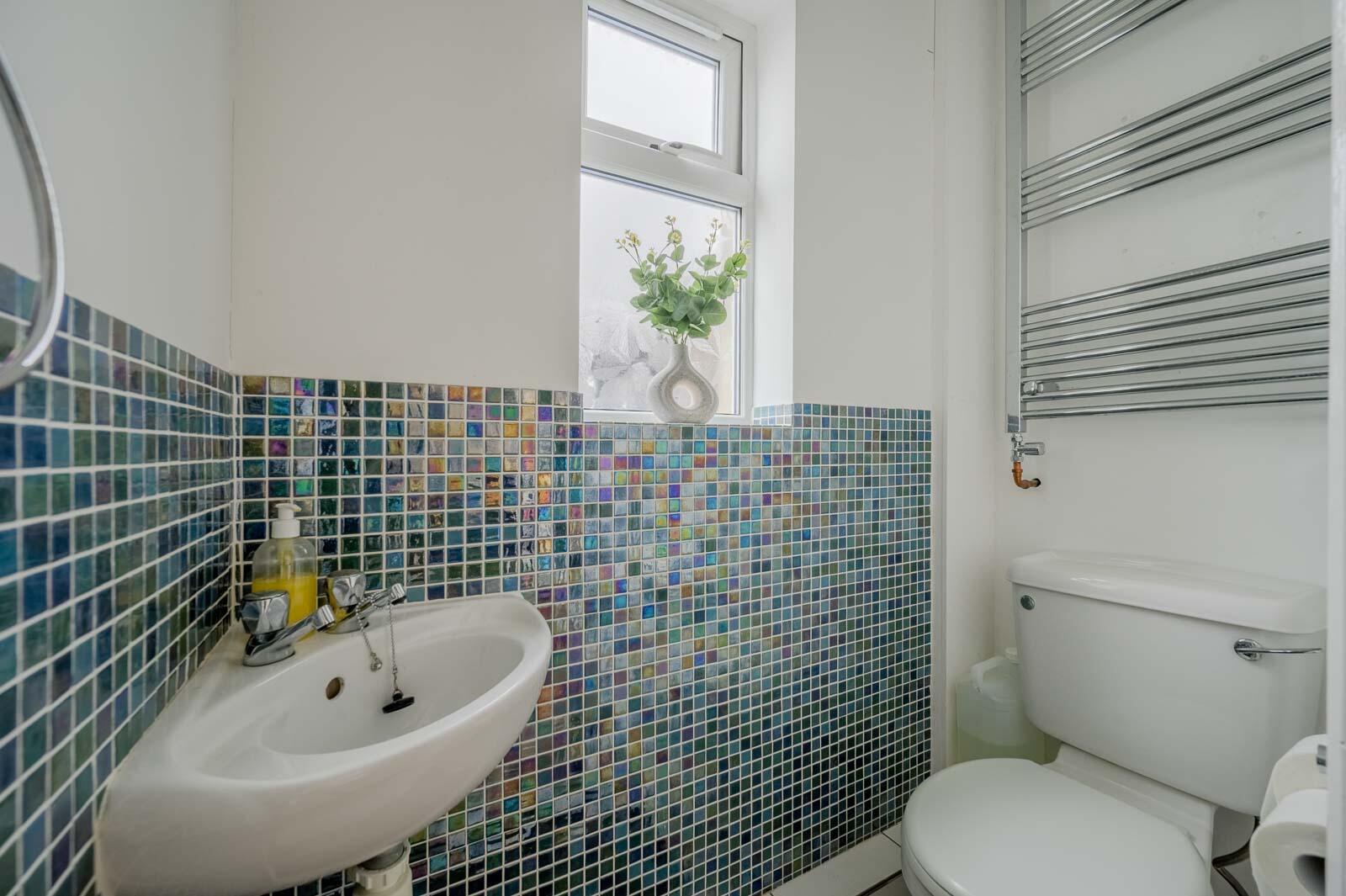 Downstairs Wc - With low flush WC, corner wall hung wash hand basin with hot and cold taps, partial mosaic tiled walls, tiled floor, towel radiator.