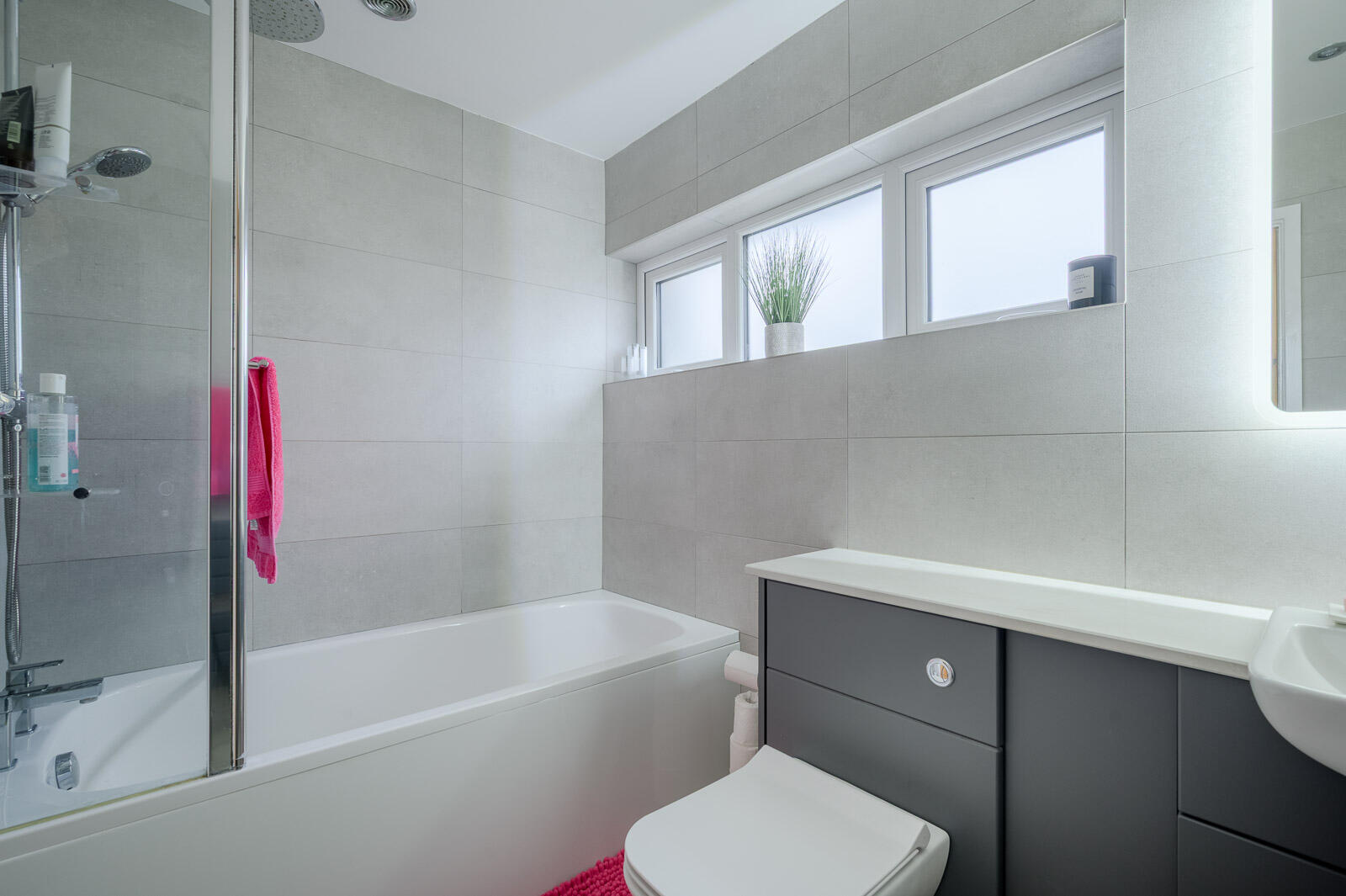 Bathroom - 2.62m x 1.85m (8'7 x 6'1) - White suite comprising of close coupled WC, wall-hung wash hand basin, chrome mixer tap, vanity storage below, panelled bath with mixer taps and thermostatically controlled rain shower, telephone handle attachment, recessed shelving, glazed shower screen, heated towel rail, fully tiled walls, tiled floor, extractor fan, LED demister mirror.
