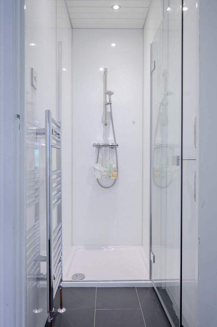 Separate Shower Room - Walk-in thermostatically controlled shower, telephone handle attachment, uPVC panels to wall and ceiling, inset spotlights, extractor fan, chrome heated towel rail.