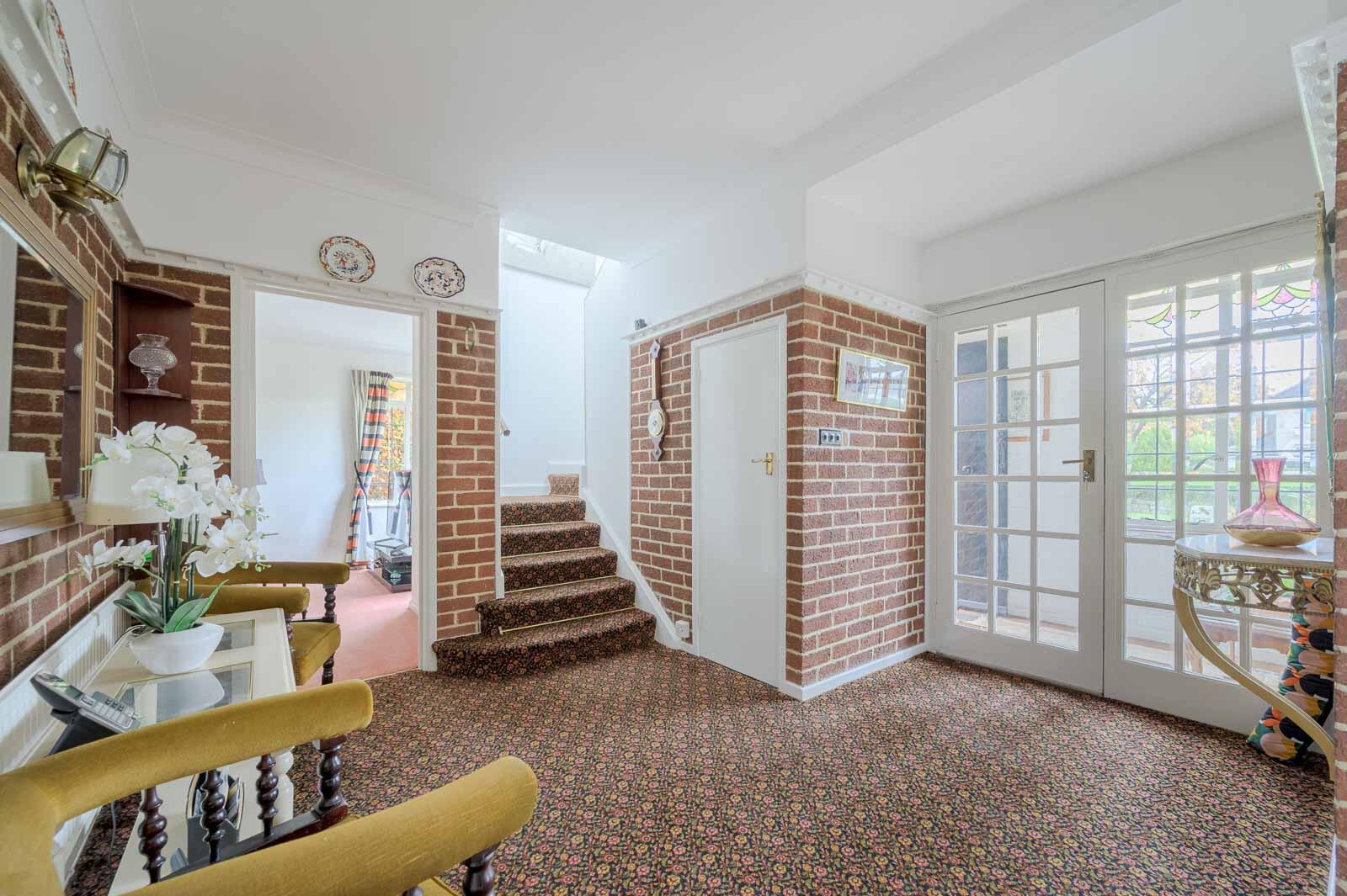 Reception Hall - With picture rail and cloaks cupboard. Original parquet floors in the hall/dining room and lounge under the carpet.