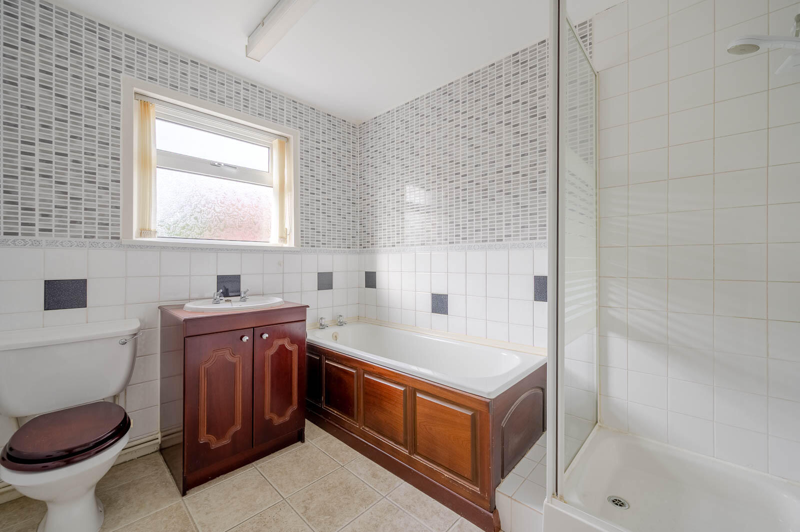 Bathroom - 2.36m x 2.29m (7'9 x 7'6) - White suite comprising of low flush WC, wall hung wash hand basin, hot and cold taps, vanity storage below, panelled bath with hot and cold taps, walk-in electric shower, telephone handle attachment, tiled walls, tiled floor.