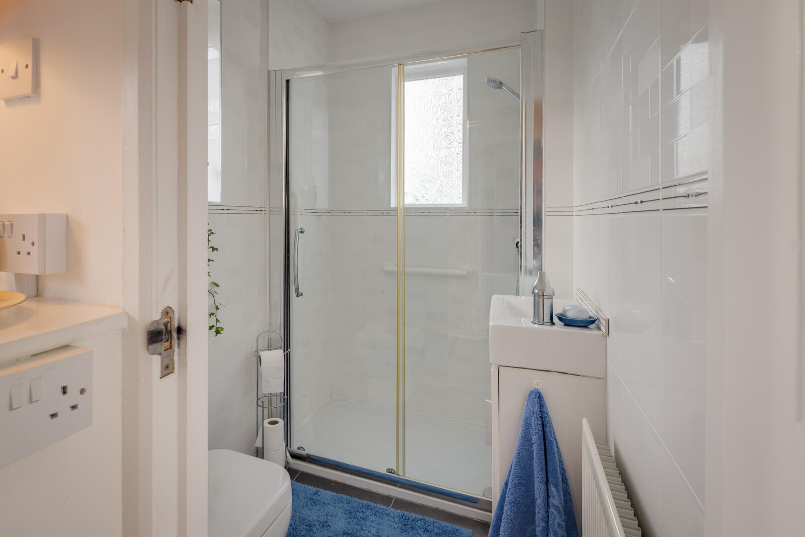 Downstairs Shower Room - White suite comprising of low flush WC, wall hung wash hand basin, chrome mixer tap, vanity storage below, walk-in thermostatically controlled shower, telephone handle attachment, tiled walls, tiled floor, extractor fan.