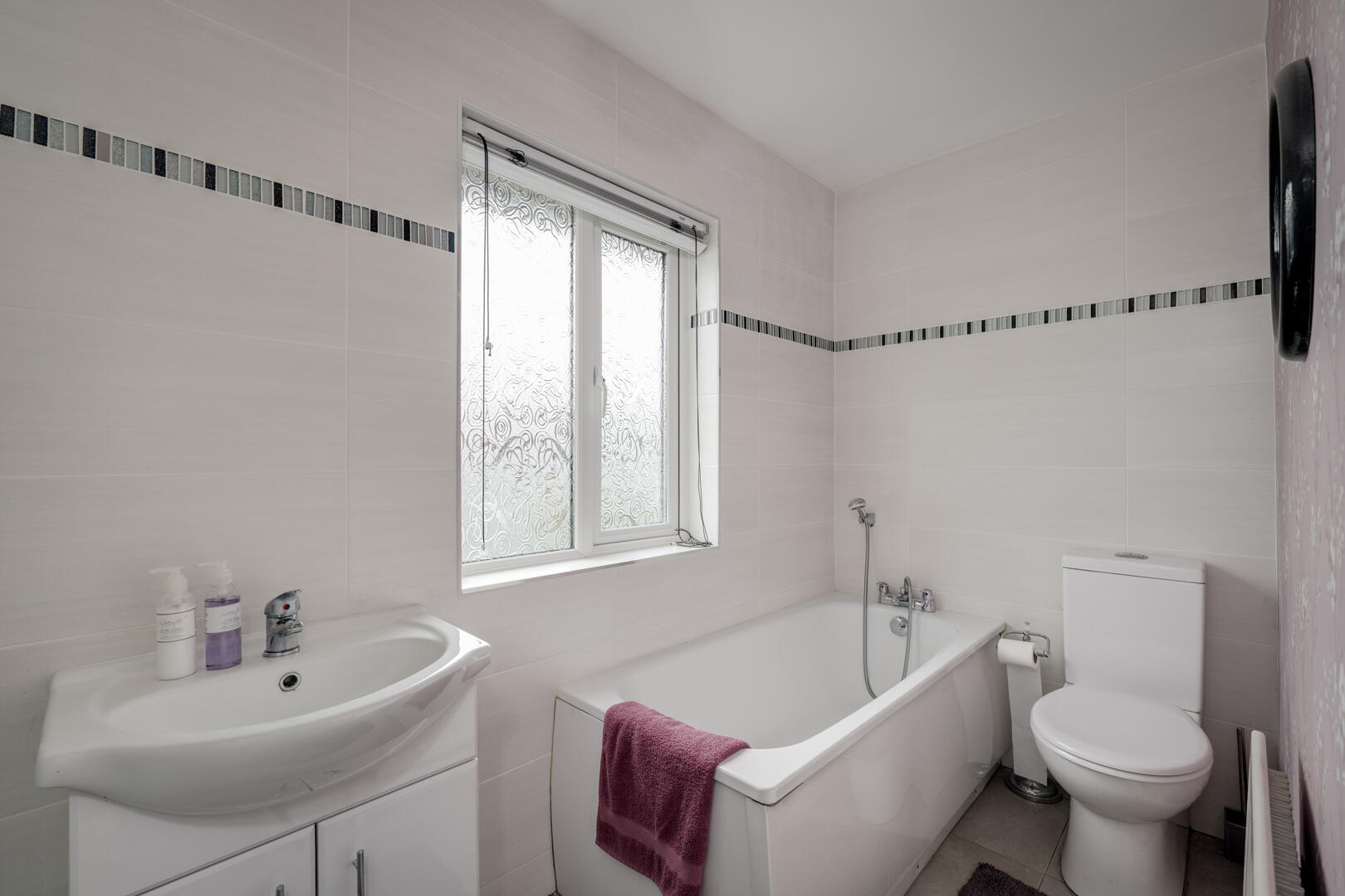 Bathroom - White suite comprising of low flush WC, wall hung wash hand basin, chrome mixer tap, vanity storage below, panelled bath with mixer taps, telephone handle attachment, walk-in thermostatically controlled shower, telephone handle attachment, sliding glazed shower screen, partially tiled walls, tiled floor, extractor fan.