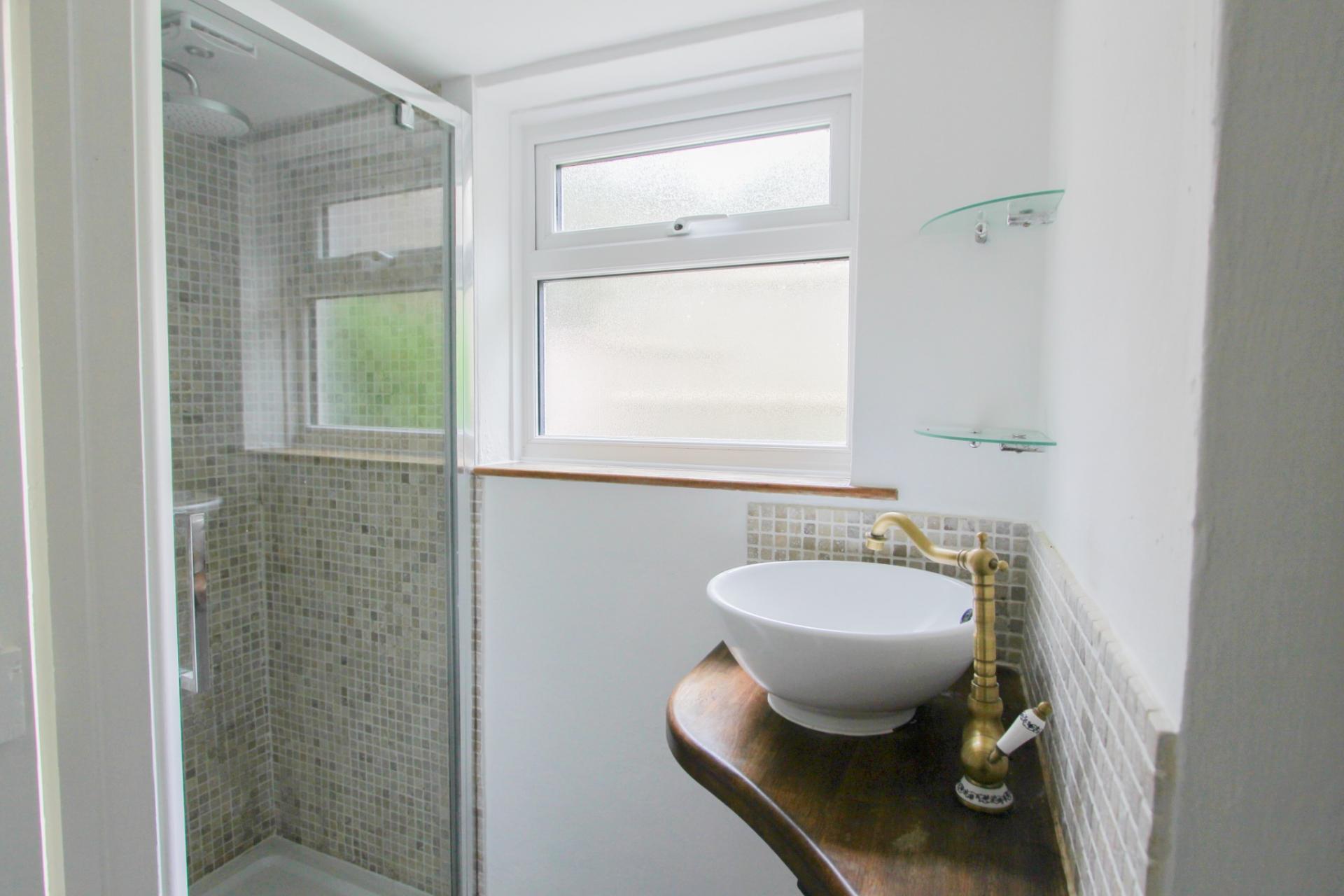 Upstairs, there are two bedrooms, with the principal bedroom featuring a small decorative fireplace and a built-in cupboard. A modern shower room is located on the ground floor.