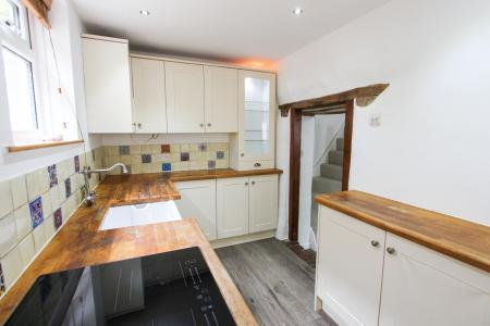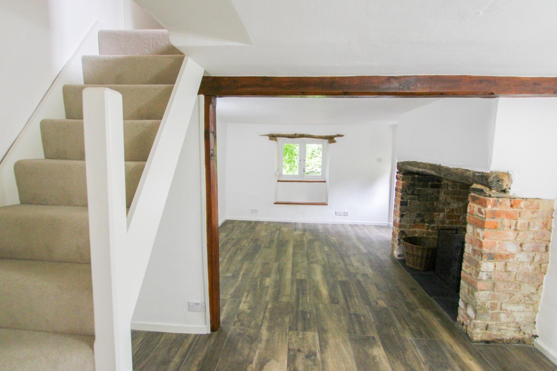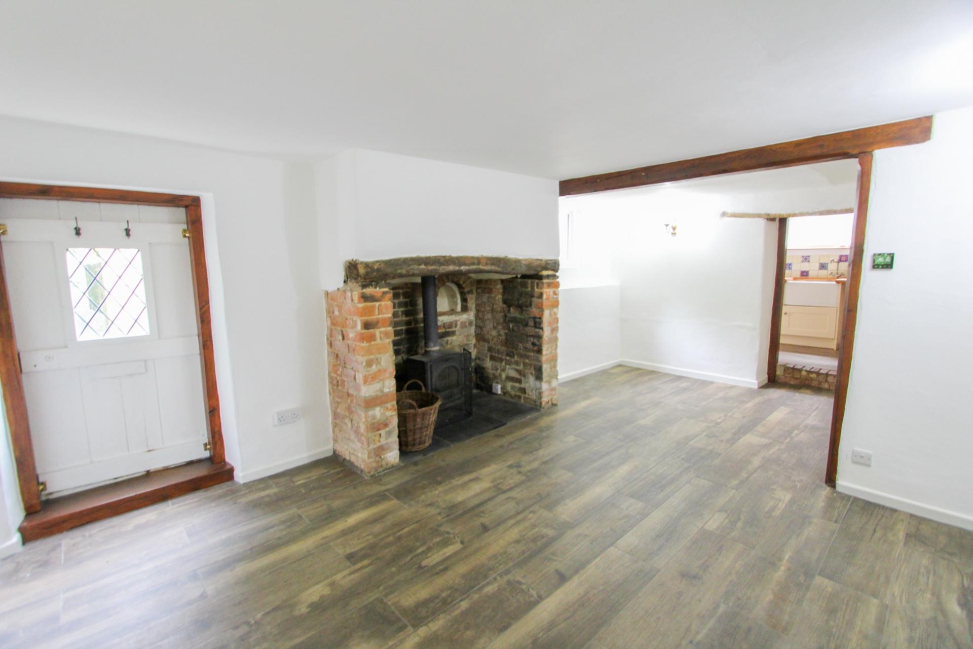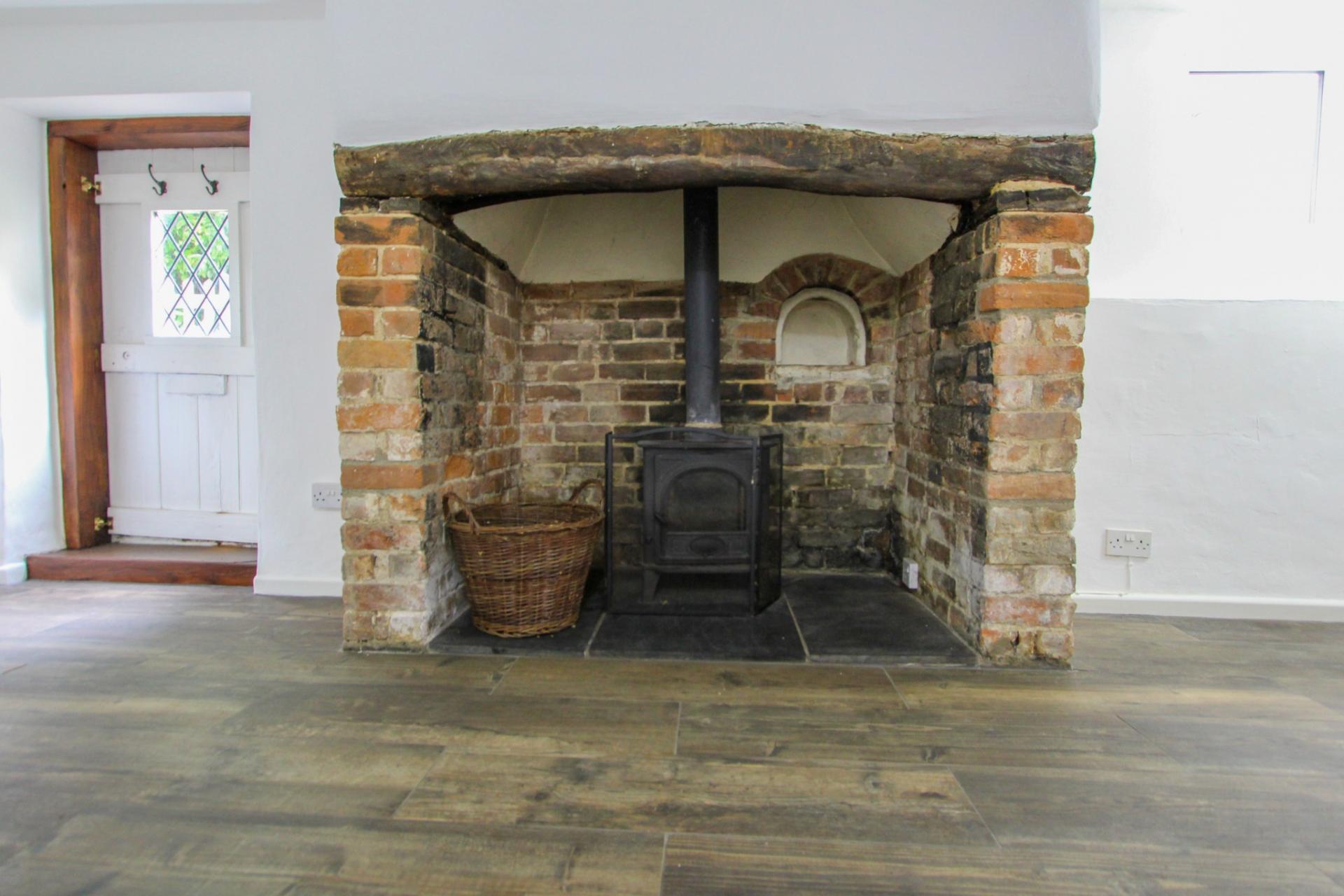 The kitchen includes an electric oven and hob, wooden work surfaces, and a Belfast sink—perfectly blending rustic charm with modern convenience. The spacious living room centres around a large inglenook fireplace with a wood-burning stove, offering a cosy retreat for colder evenings. It also has the benefit of underfloor heating.