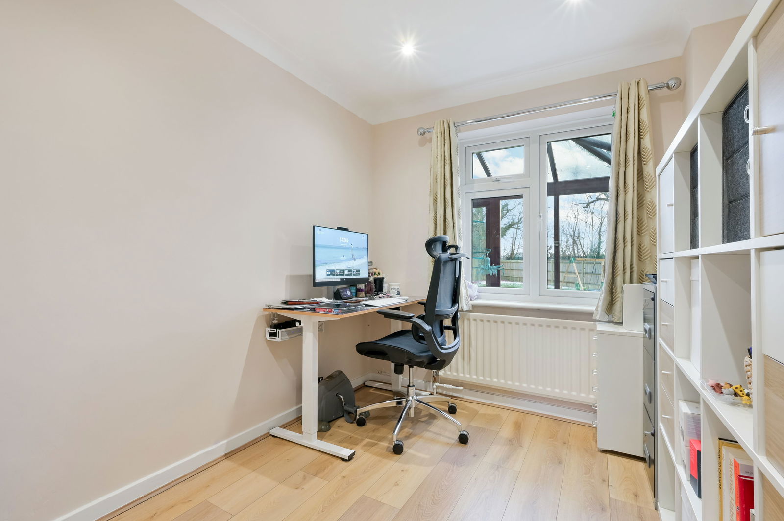 The property is set back from the road with the large driveway, which could accommodate several cars, providing privacy to the house. Through the front door you are welcomed by the entrance hall with access to the reception room, study, cloakroom and dining room through to the kitchen. The reception room has double aspect with a sun trapped conservatory to the rear pouring in natural light and double doors into the garden, and benefits from a wood burning fireplace. The dining room flows into the kitchen which has a range of cabinetry and space for appliances with a separate utility room which has access into the double garage.