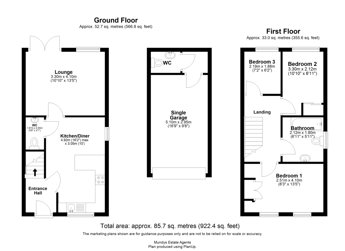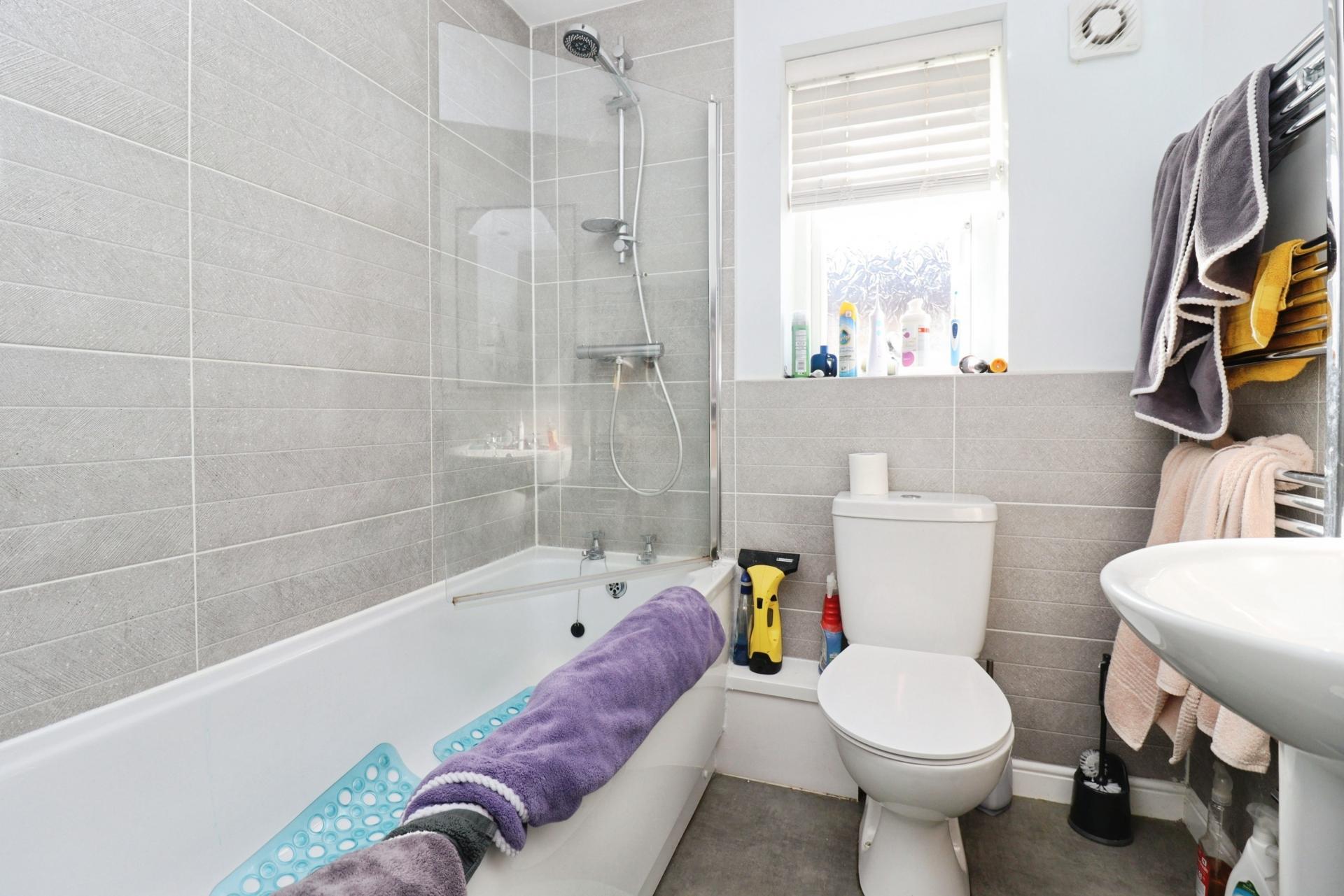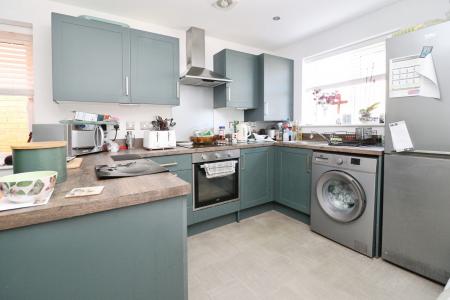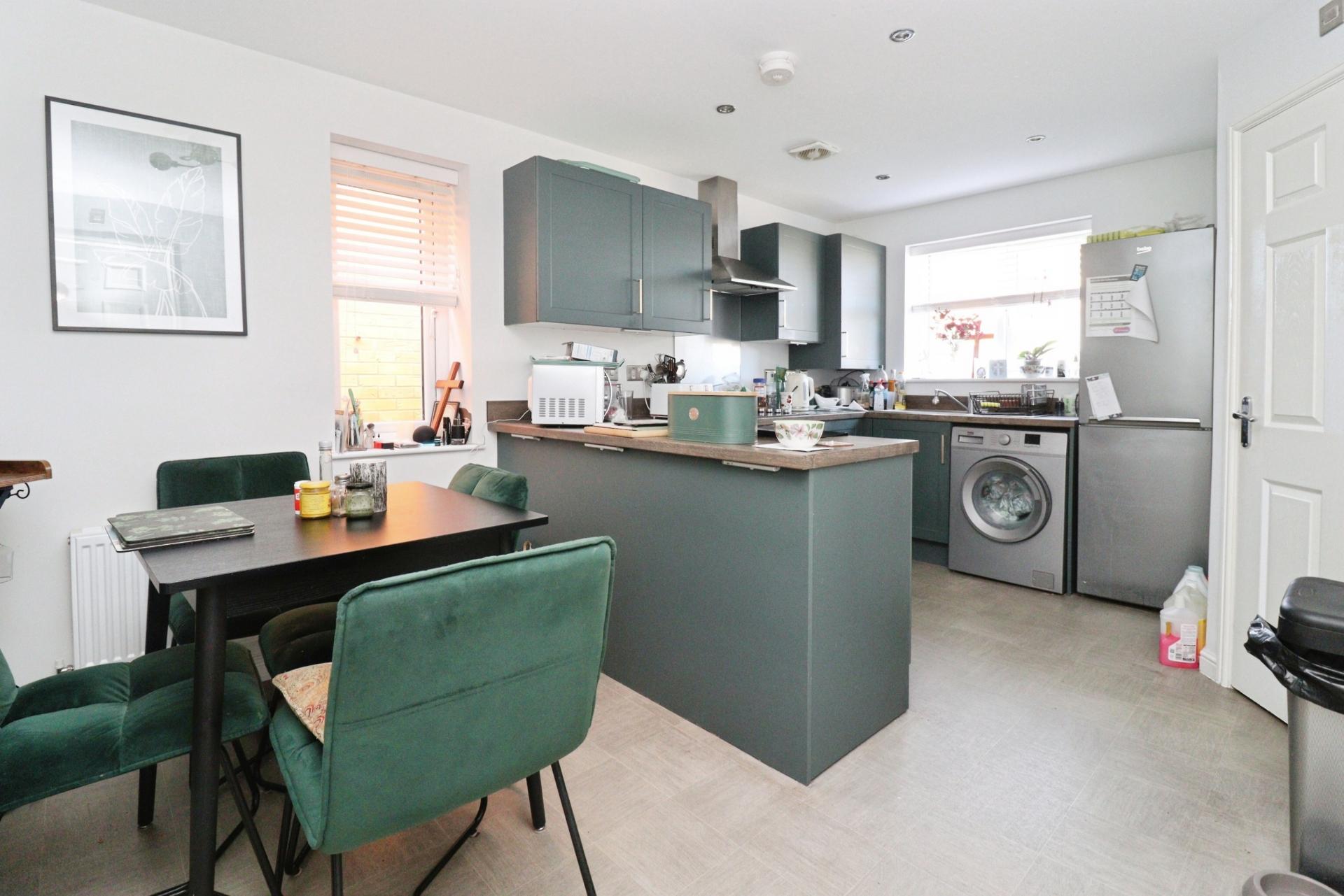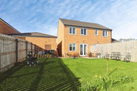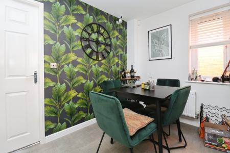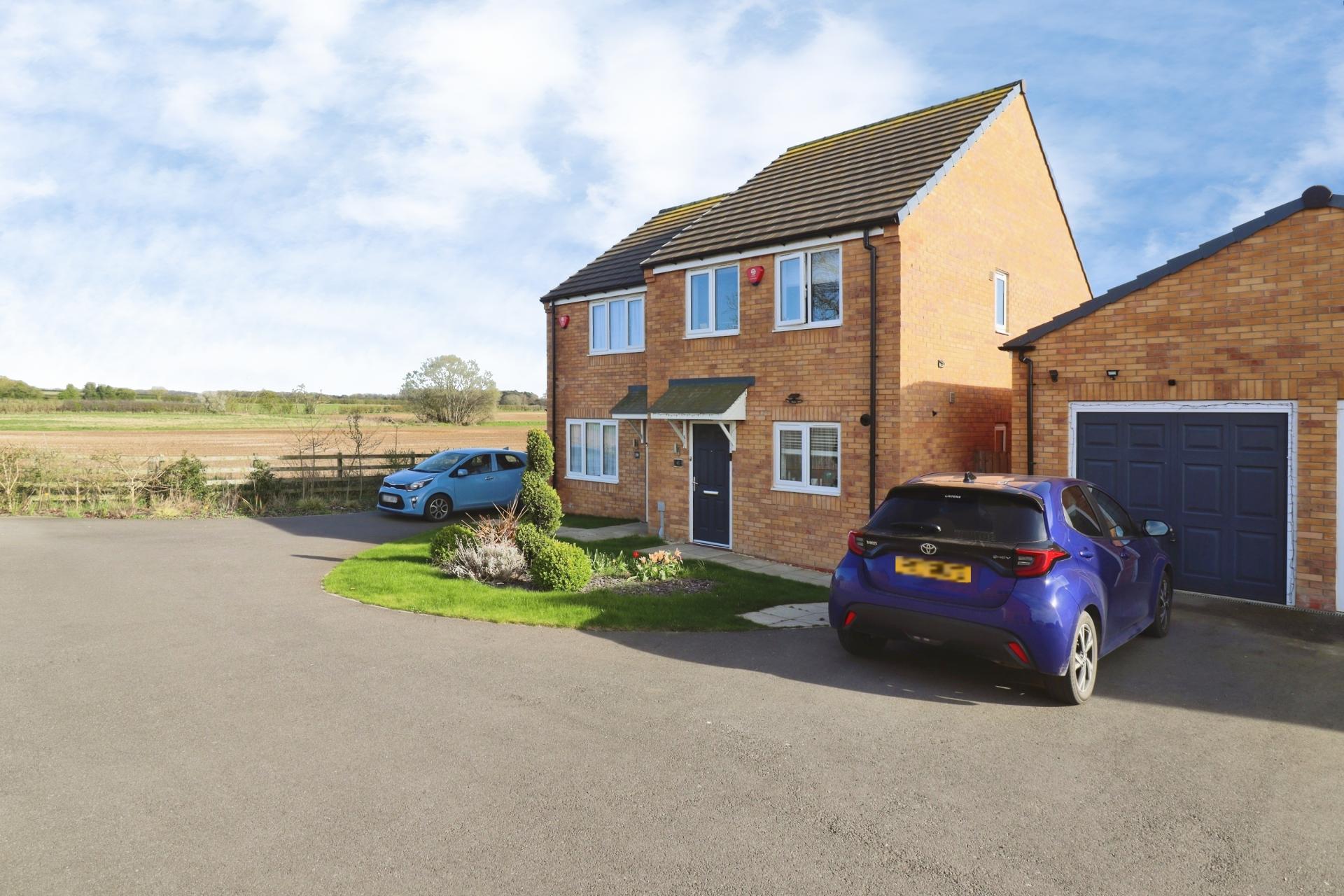 DESCRIPTION Completed in 2023, this well-presented family home has the added benefit of a much larger than average garage, including a separate WC, offering potential for a variety of uses, including conversion to a home working space or similar, subject to any necessary consents. The accommodation benefits from gas fired central heating and UPVC double glazing. A further feature is the generous south facing rear garden. The accommodation briefly comprises of an entrance hall, open plan dining kitchen with peninsular Island providing additional storage, WC and lounge with French doors opening onto the garden. To the first floor there are three bedrooms, two with fitted wardrobes and a bathroom with mains shower over the bath. To the front of the property there is a driveway providing off road parking and access to the large garage, which benefits from power, water and drainage, along with a separate WC, making it suitable for a range of uses, subject to any necessary consents. The main gardens are located to the rear and are south facing, laid to lawn with corner beds stocked with a variety of shrubs and a patio seating area.