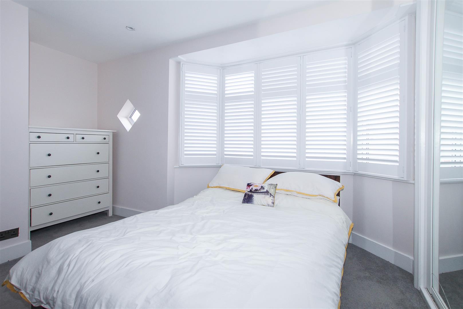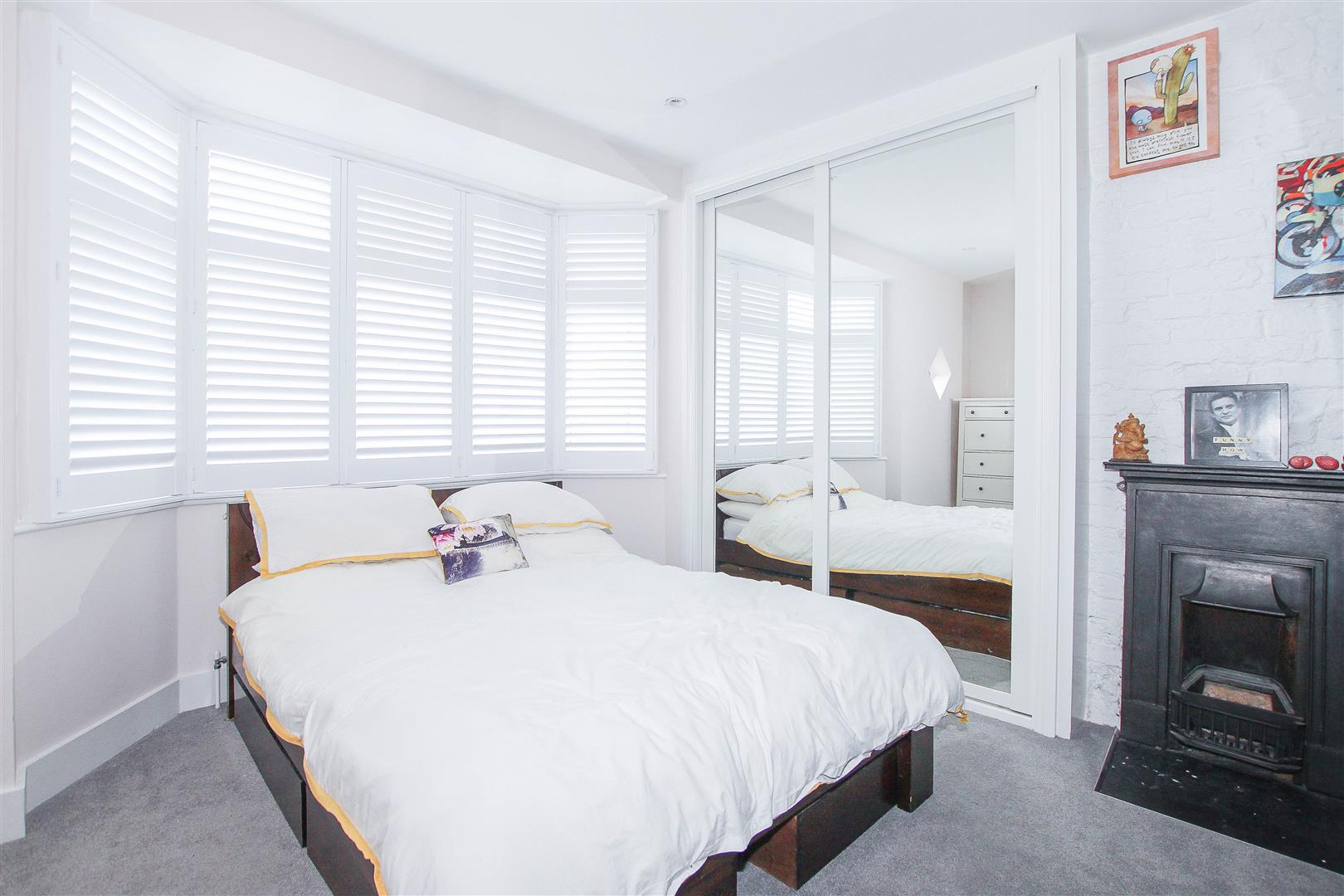 Bedroom One - 4.60m x 2.79m (15'1 x 9'2) - Built-in mirrored wardrobes. Feature fireplace. Modern, shuttered windows to front aspect.