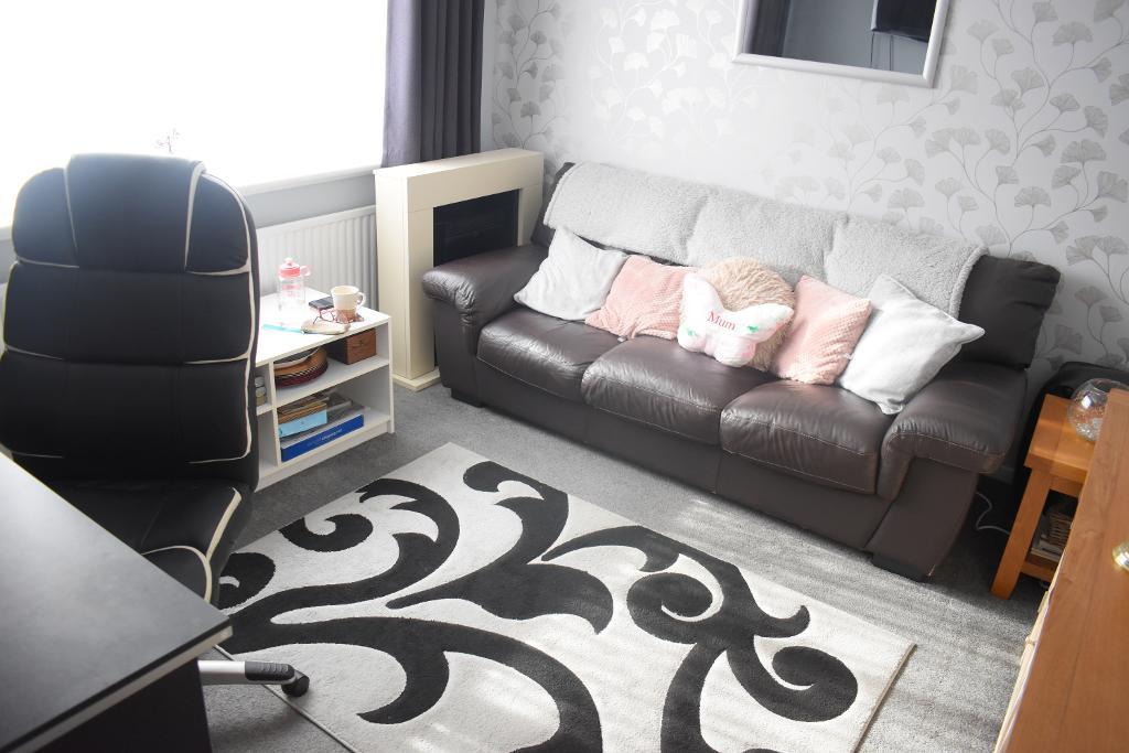 The lounge is instantly flooded with natural light thanks to the large double glazed window to front which really shows off the carpeted flooring and papered walls.