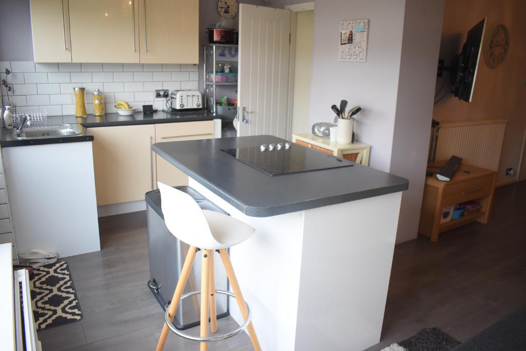 Moving into the spacious living room there is the wooden effect flooring which flows through from the hallway as well as part painted, part papered walls and a large opening into the stunning kitchen.