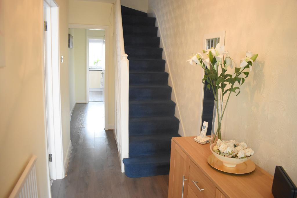 The lengthy hallway has a real homely feel to it with wooden effect flooring and carpeted staircase which has an understairs cupboard consisting of meters. The hallway also features wooden doors opening into the lounge and living room along with an opening leading to a further hallway which has door leading into the ground floor shower room.