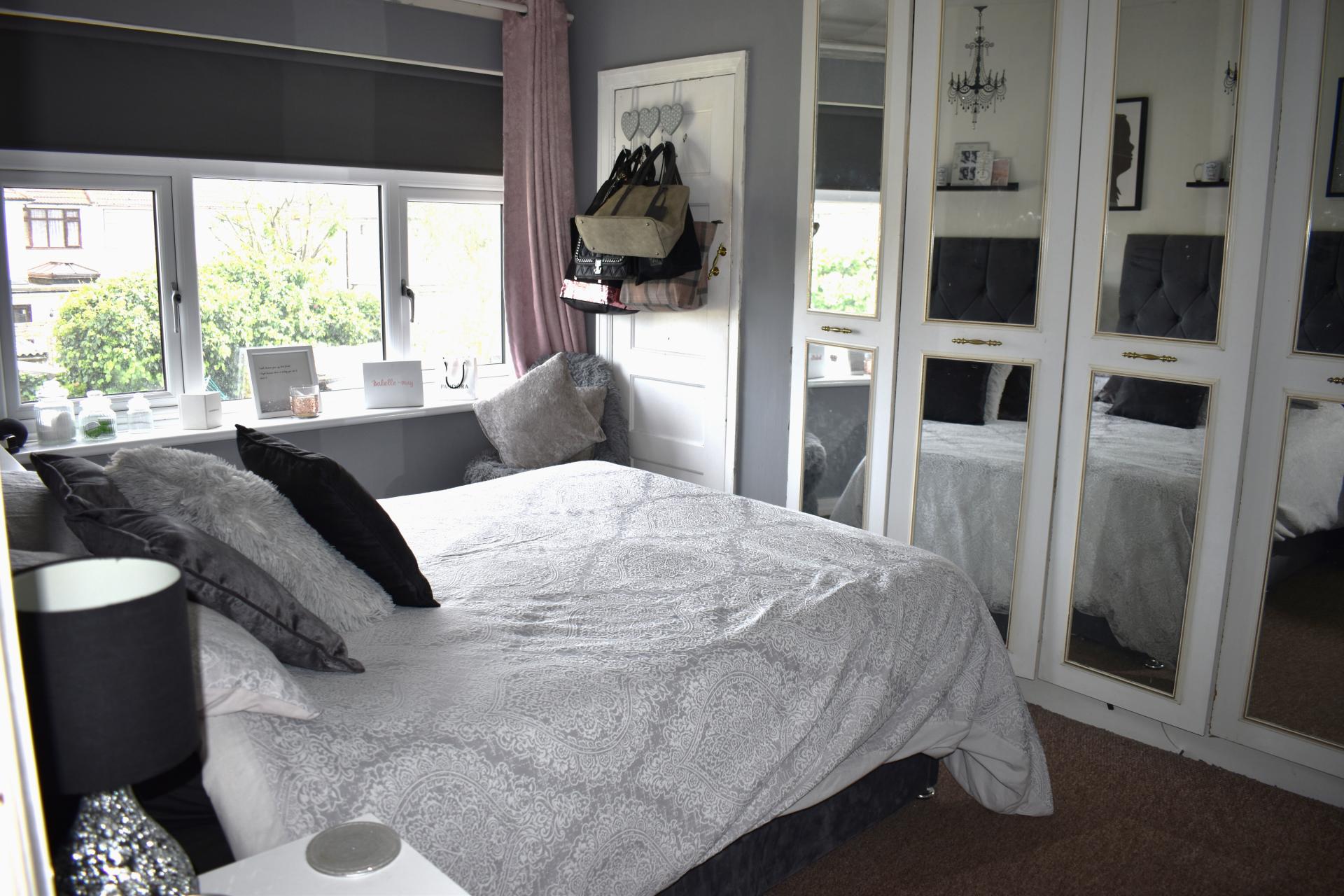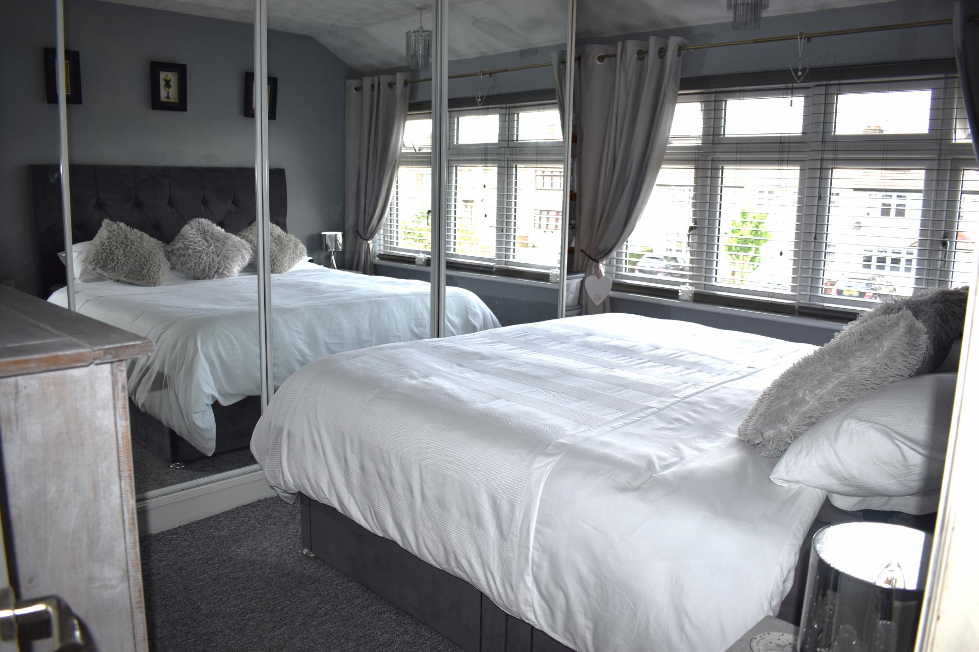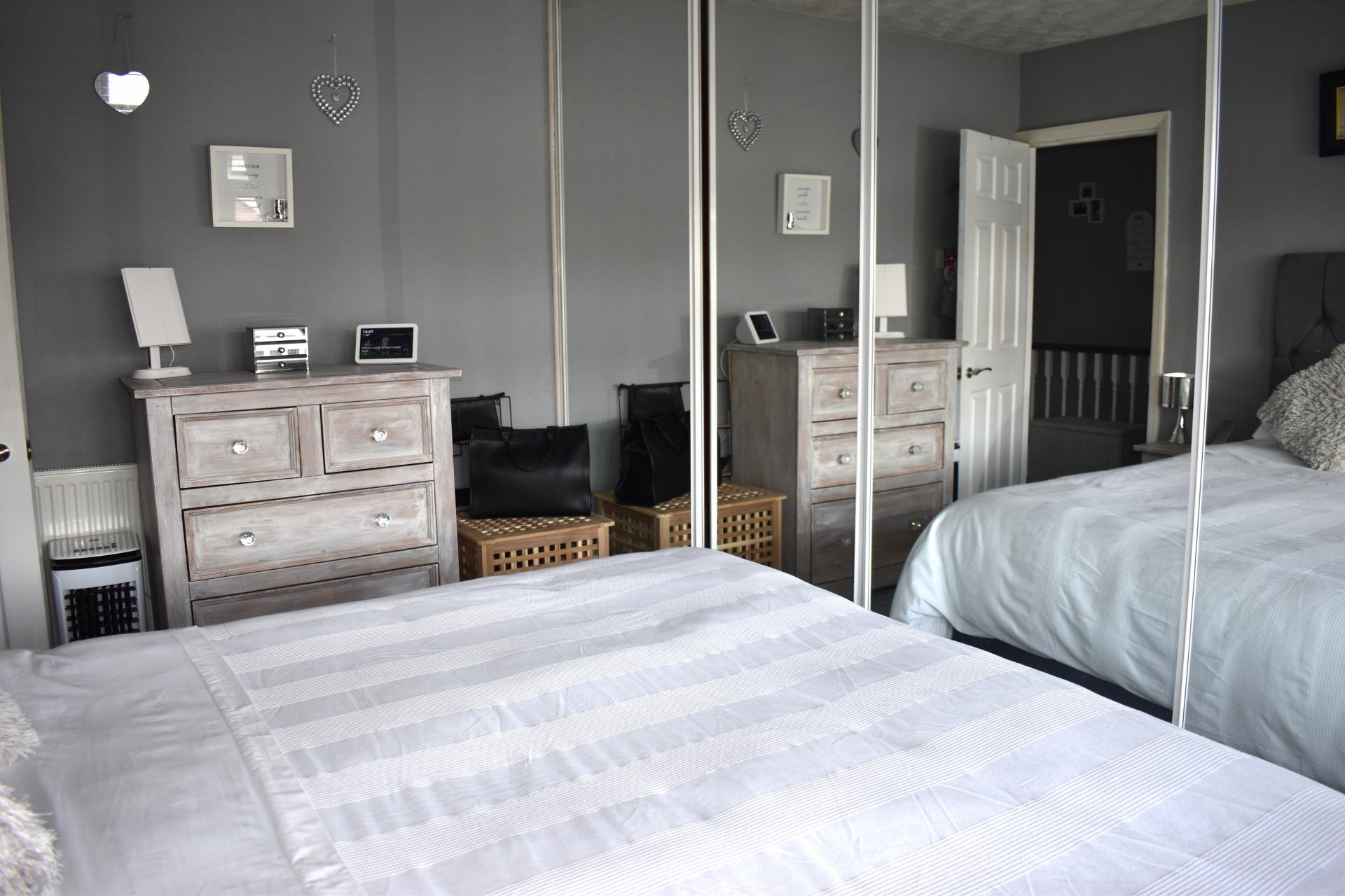 BEDROOM ONE: 13’1 X 10’2: Double glazed window to front. Painted papered walls, carpeted flooring, mirrored sliding door wardrobes, radiator and power points.
