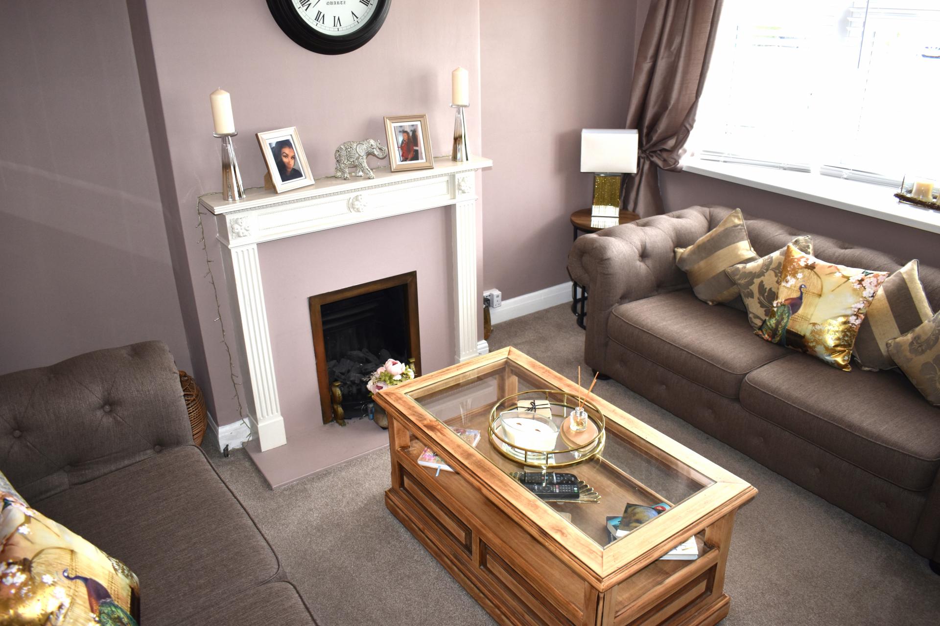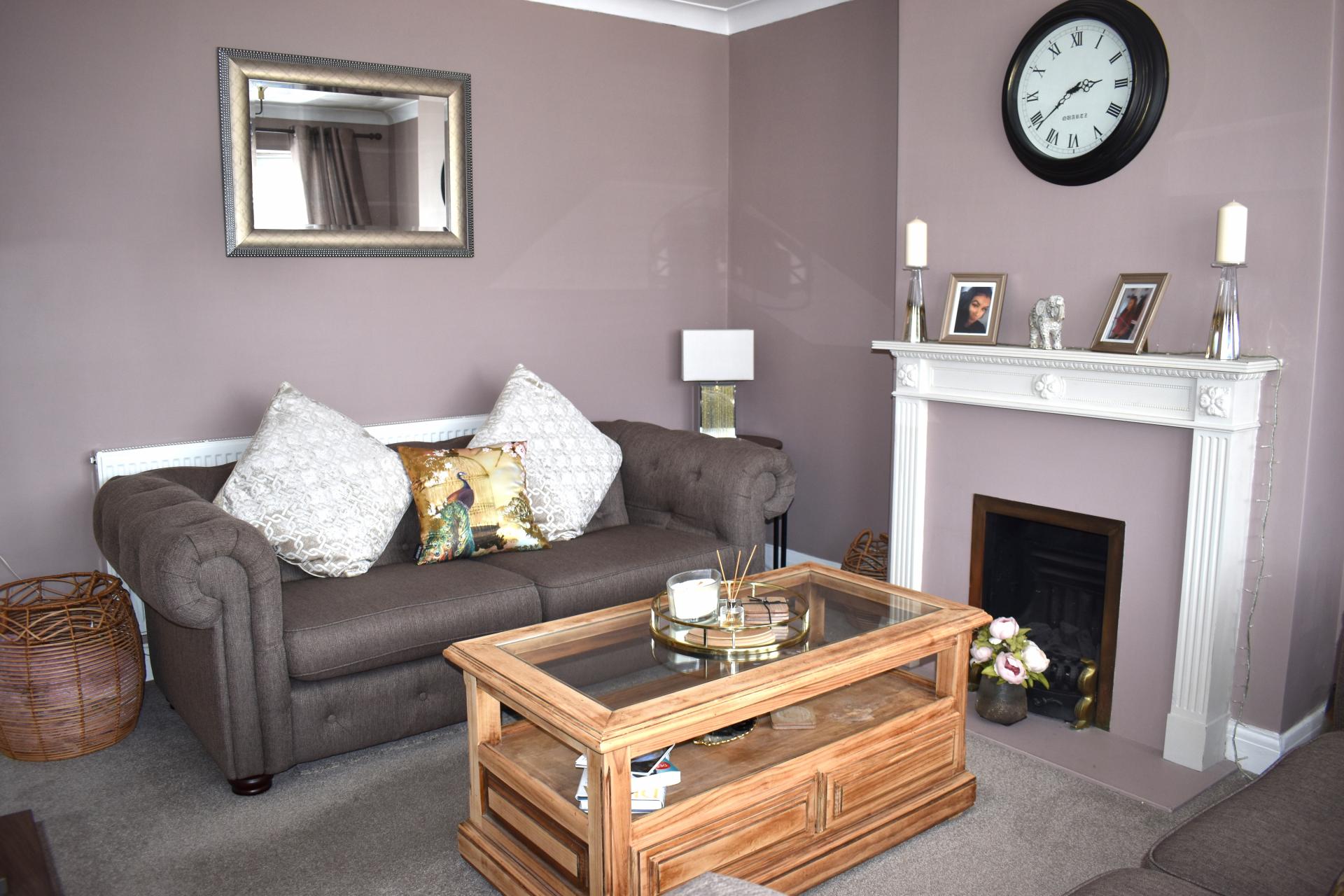 LOUNGE: 12’11 X 11’1: Double glazed bow window to front. Painted walls, carpeted flooring, fireplace with coal effect gas fire (untested), radiator, coving and power points.