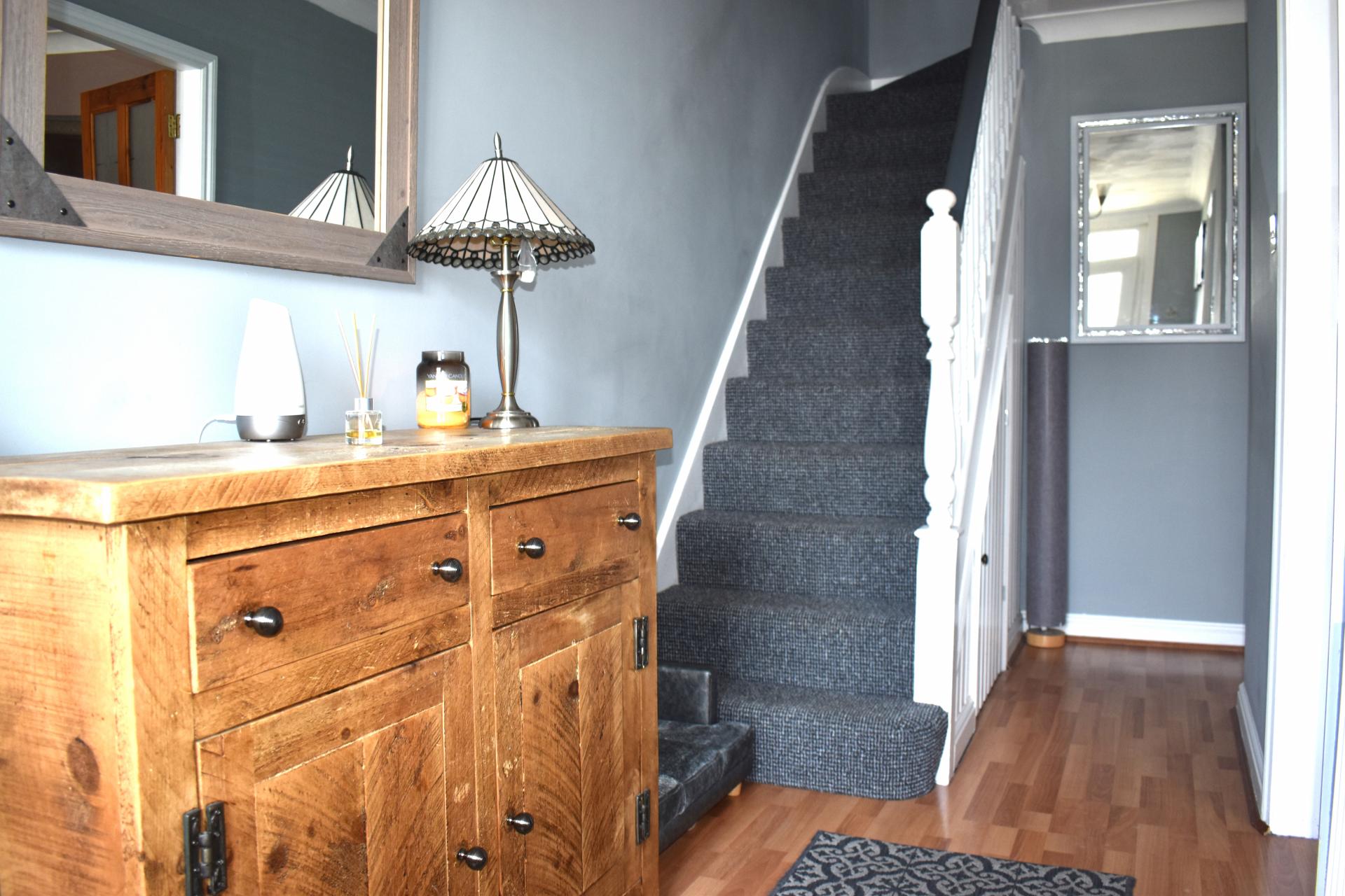 ENTRANCE HALL: Painted walls, laminated flooring, carpeted stairs to first floor with spindled balustrade and understairs storage cupboard housing meters etc. Radiator, coving and doors to: