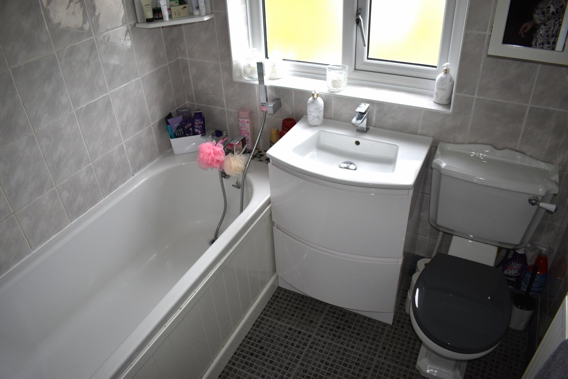FAMILY BATHROOM: Double glazed obscured glass window to rear. Panelled bath with chrome shower mixer tap, separate overhead electric shower and glass shower screen. WC and wash hand basin with chrome mixer tap and white hi-gloss vanity unit under. Tiled walls, tiled effect vinyl flooring and radiator.