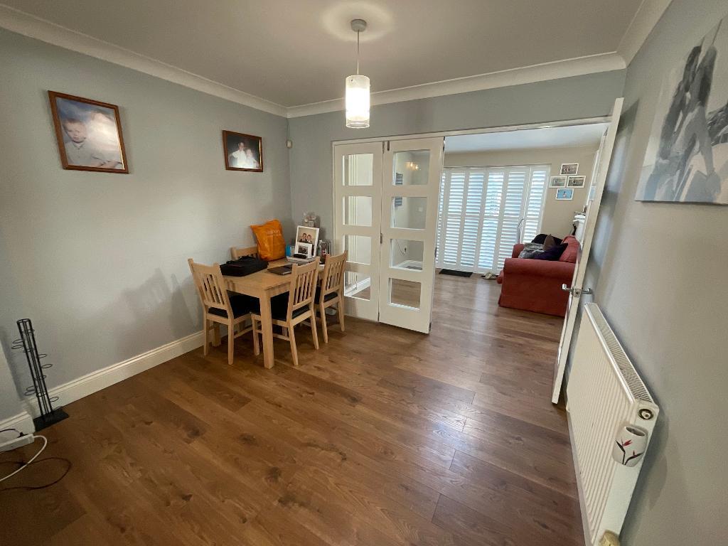 The large living room is instantly flooded by natural light thanks to the double-glazed bay window to the front, this light really shows off the wooden effect flooring that flows through from the hallway. There is a large opening to the rear that leads into the dining room which has more glass panelled wooden doors that open into a further diner.