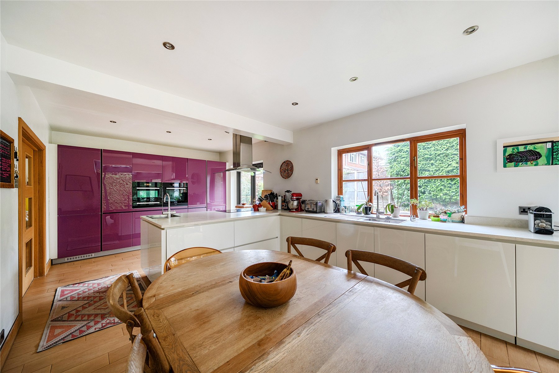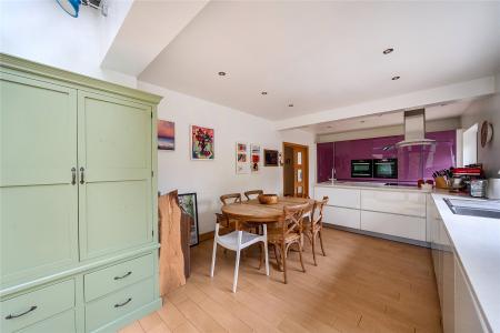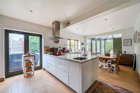 The welcoming entrance hall leads to a choice of beautifully proportioned reception rooms. To the front, the elegant living room features a large bay window allowing plenty of natural light, while the study and playroom provide ideal spaces for working from home or family use. At the heart of the property lies a stunning open-plan kitchen and dining area, recently improved with sleek modern cabinetry, a large central island and integrated appliances. The room opens onto a bright garden room with French doors leading to the patio and garden, creating a seamless link between indoor and outdoor living. A family room, utility area and downstairs cloakroom add further convenience and flexibility on the ground floor.